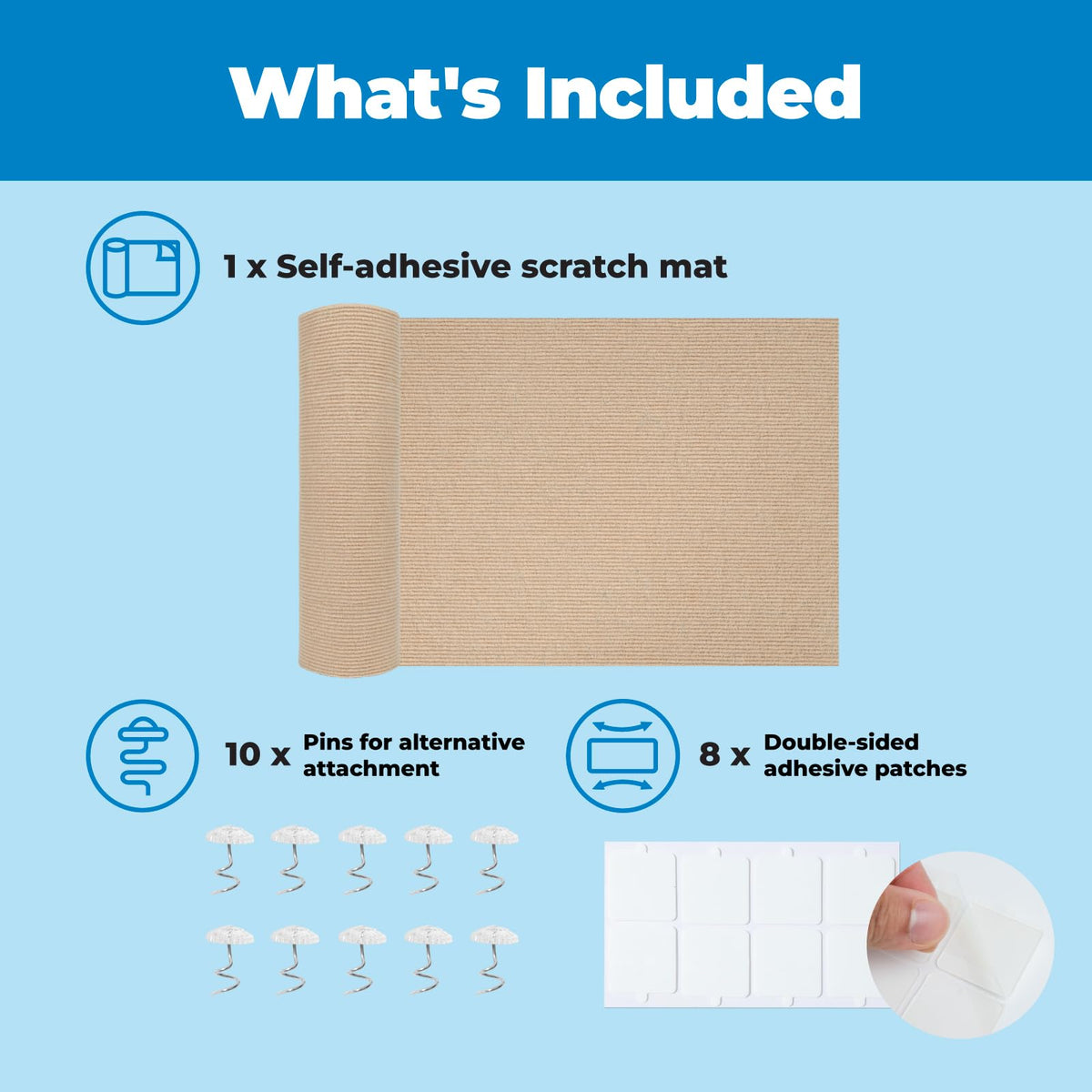 Instant Furniture Rescue - Peel & Stick Cat Scratcher - Protect your sofa, carpet by simply peeling off the release film and pressing this self-adhesive cat scratching mat into place. Say goodbye to claw marks and shredded upholstery! | Custom-Fit Cat Scratch Mat Furniture Protector This cat scratch material is trimmable and flexible, making it ideal for any space-sofa arms, corners. Simply cut to size for full coverage and long-lasting protection from claw mark | Non-Slip, Durable & Mess-Free Scratch Pad for Cats Our cat scratch mats feature an anti-curl aluminum backing and cushioned polyester surface for comfort and stability. No shifting or mess-just consistent scratching without damage to your home | Easy Setup with Bonus Adhesive Stickers Included Install in seconds - just peel and stick! Each cat scratch pad includes extra replacement adhesive stickers so you can refresh the grip and extend use with no additional tools needed | Pet-Safe, Eco-Friendly Cat Scratch Furniture Protector Crafted from non-toxic, eco-friendly materials, these cat scratching mats are safe for pets and easy to maintain. Just wipe clean with a damp cloth. Ideal for cat owners seeking a sustainable solution