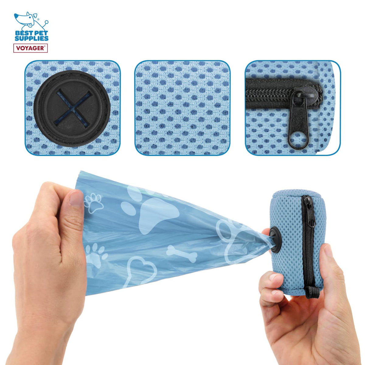 Best Pet Supplies Dog Poop Bag Holder Leash Attachment With 15 Bags, Baby Blue, Reusable Mesh Dispenser Pouch For Travel, Walkin
