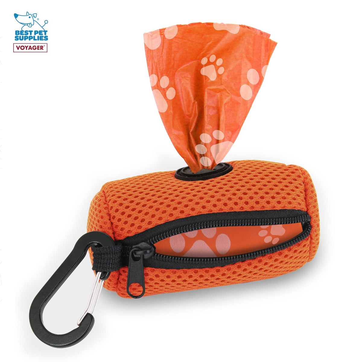 Best Pet Supplies Dog Poop Bag Holder Leash Attachment With 15 Bags, Orange, Reusable Mesh Dispenser Pouch For Travel, Walking,