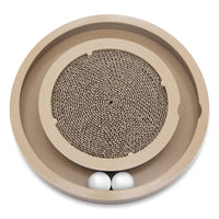 Spin and Chase Cat Scratcher – An interactive toy that keeps your pet chasing, scratching, and playing this unique Scratch & Spin system features a corrugated cardboard pad in the middle and two balls they can chase in the inner track. | Replaceable Cardboard Pad – Our double-sided cat scratching board can be swapped out for other round cat scratching pads for cats, so you can support active play long after this pad is torn to shreds. Perfect for supporting kittens and cats of all ages. | Two Interactive Balls for Cats – Inside the track of our cat scratching pad you’ll find two smooth-rolling balls that cats will love to swat, bat back and forth, and chase, which is good for supporting both physical and mental daily health. | Non-Slip Base for Stability – The Best Pet Supplies cat pad scratcher is fitted with four skid-resistant “feet” on the bottom that help keep it from sliding around on wood, tile, linoleum, or carpet, so cats can swat, scratch, pounce, and swipe safely. | Durable and Contemporary Design – A small 10.25” diameter means you can easily keep this cat toy in the corner of your living area or right in the middle of the room, while the rustic, naturally-recycled wood fits seamlessly with other home decor.