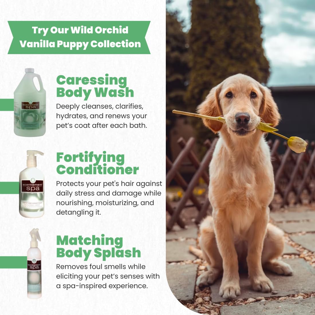 With Best Shot’s Scentament Spa Caressing Body Wash, now you and your pet will bathe in fragrant luxury! This aromatic skin cleanser cleans your pet’s sensitive coat, eases brushing time, and detangles in an effective way. Infused with certified organic grape seed oil, silk protein, and Vitamin E, our body wash deeply cleanses and detoxifies your pet’s coat. The hypoallergenic cat and dog shampoo is free from harsh and harmful chemicals and is gentle on your pet’s skin. Regular application restores and hydrates the pet’s coat from within. Loaded with the proprietary essence of cucumber and melon along with the finest botanicals, our Caressing body wash gives your pet a warm, cozy, and spa-inspired classic experience after every bath. Best Shot’s Scentament Spa Caressing Body Wash is suitable for dogs, cats, puppies, and kittens over 12 weeks old. The shampoo is available in a 1-gallon bottle and can economically dilute up to 10:1. Matching body splash is also available.