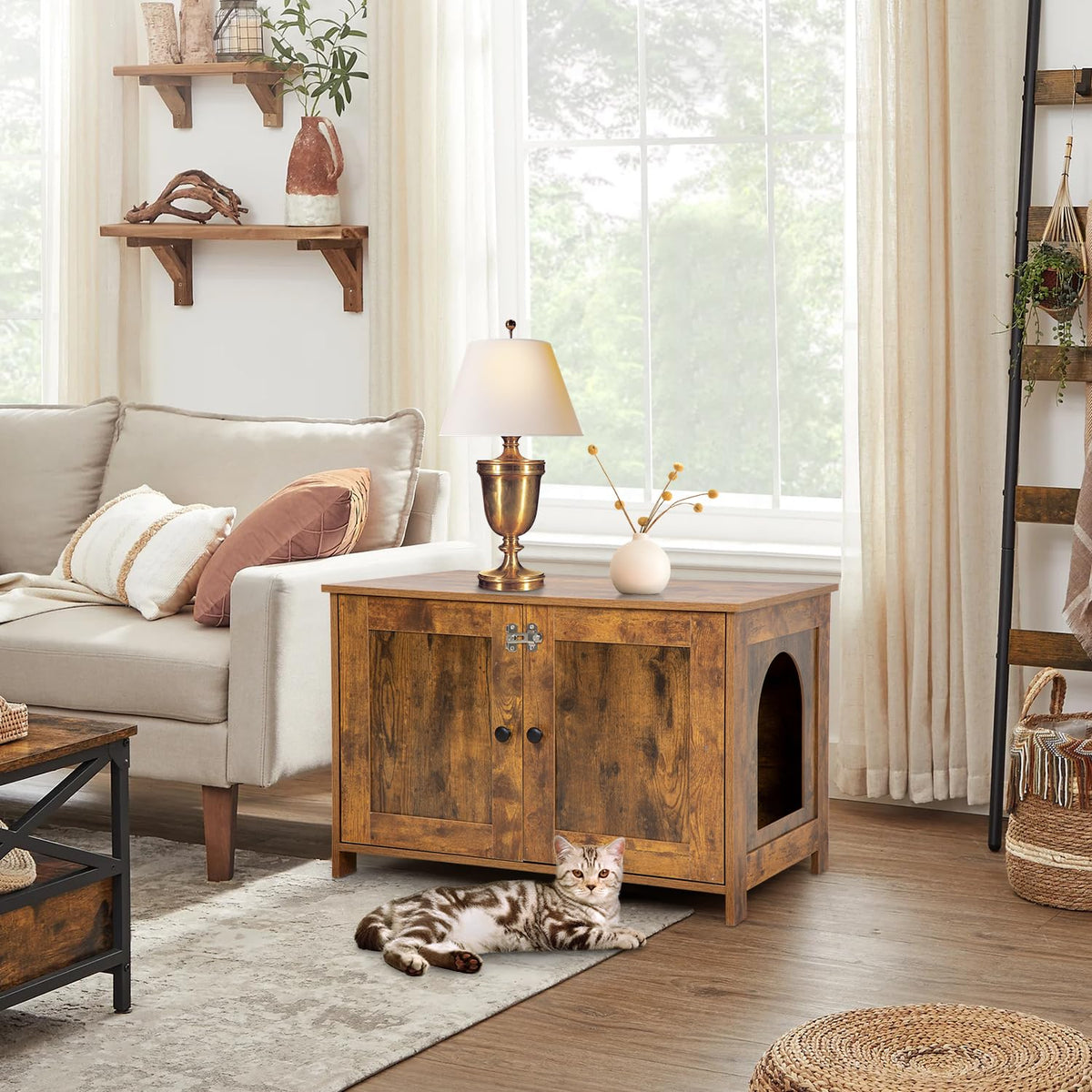 This Cat Litter Box Furniture Serves As An Attractive Cover To Hide Away The Cat Litter Box And Confines All The Litter Mess Inside, While Providing Useful Space For Many Organizing Options. It Is Designed To Fit Any Size Litter Box, Including The Extra-Large Automatic Litter Boxes. It Comes With A Removable Partition Wall Creating A Space To Store Litter, Scoop And Other Supplies.