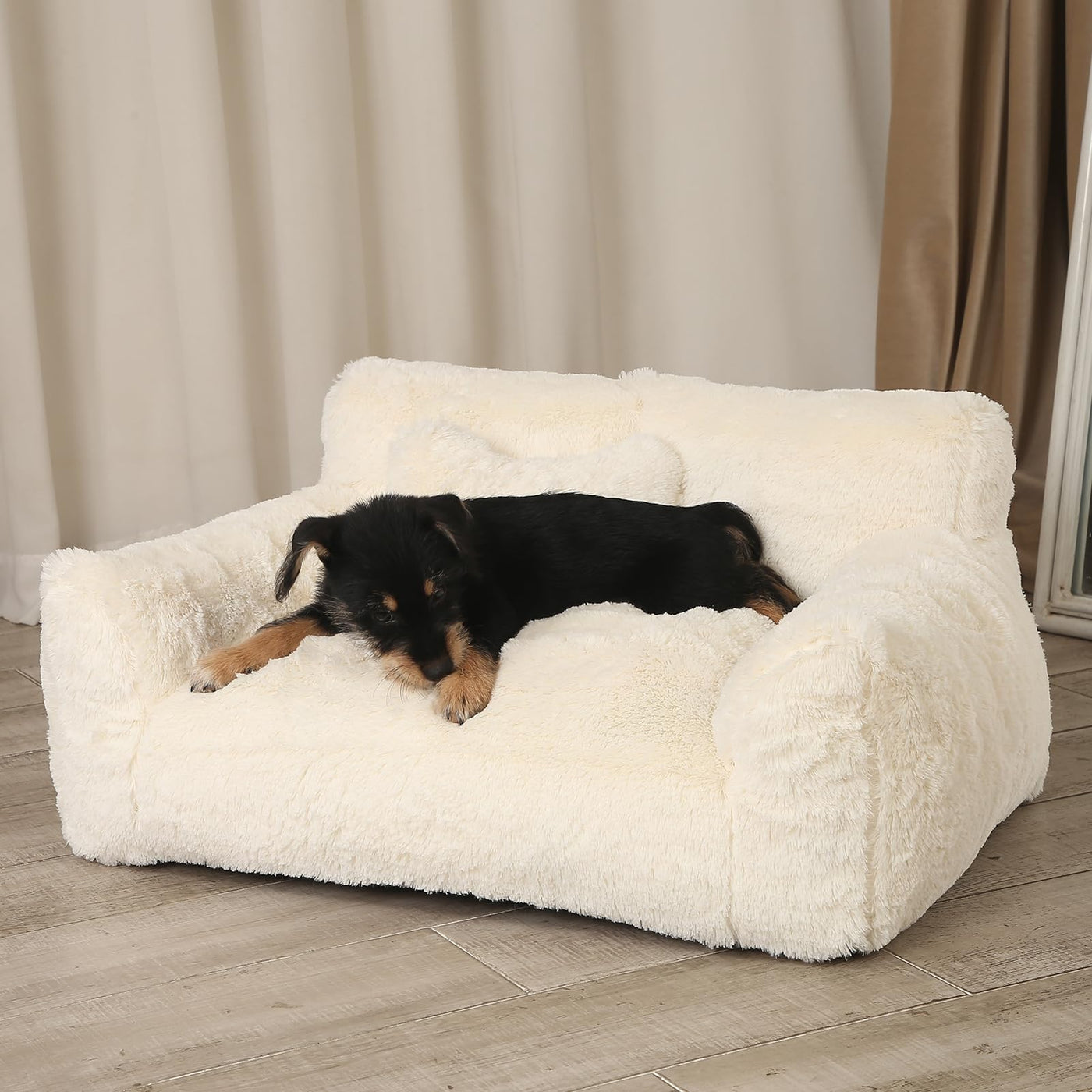Bestroyal Fluffy Cat Couch, Small Dog Bed With Bone Shaped Pillow, Anti-Anxiety Pet Bed With Washable Cover, Cream