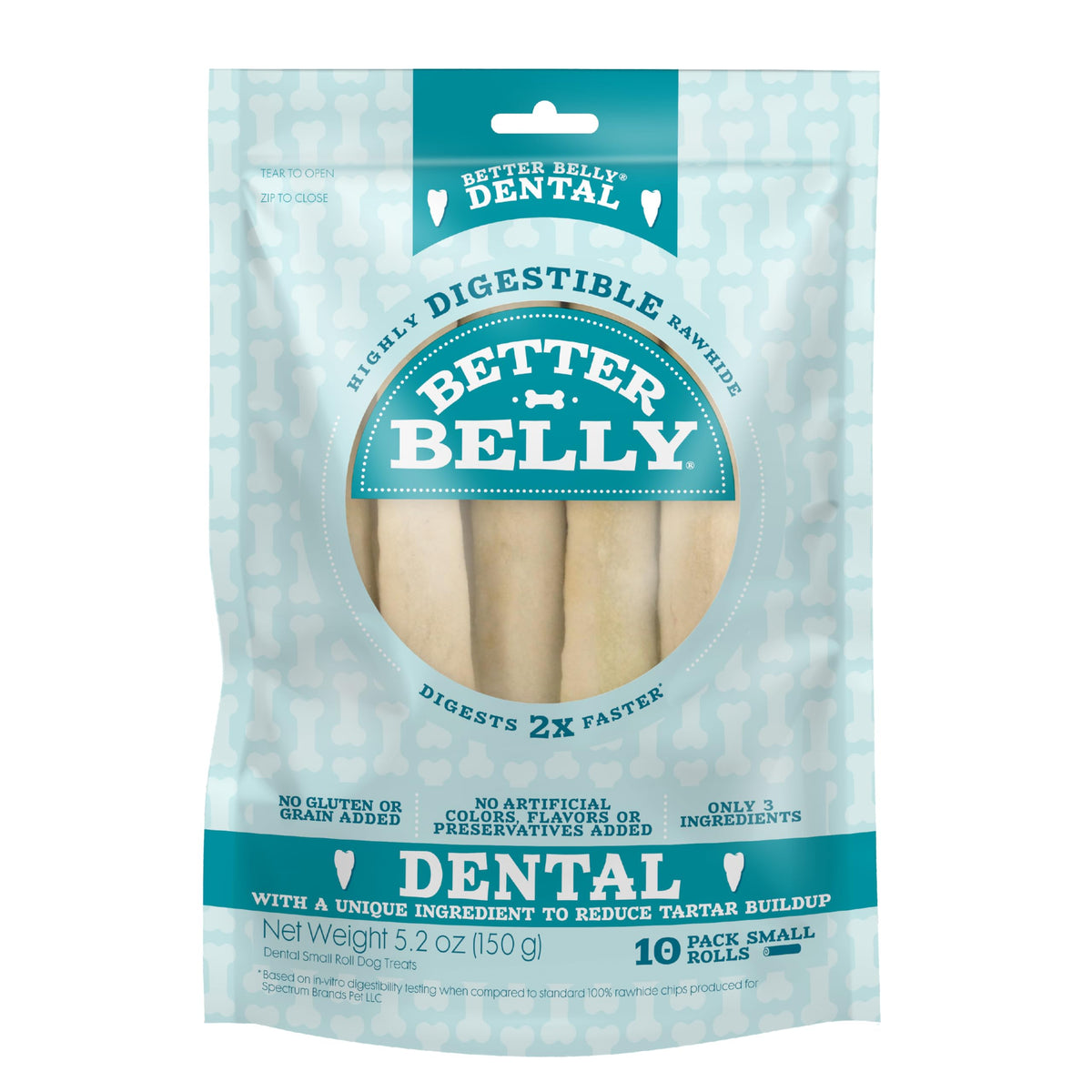 Better Belly brand offers a variety of highly digestible chews for your dog. Our unique manufacturing process helps break down rawhide fibers so your pup can digest them faster. With no gluten, grains, artificial colors or artificial flavors added, you can treat your dog to a chew you both feel good about. Better Belly Dental Rolls are sure to become your poochs favorite chew. Made with a unique ingredient to reduce tartar buildup, these chews digest two times faster than standard rawhide.* They contain only three ingredients - beef hide, sodium hexametaphosphate and natural chicken liver flavor - with no added grain, artificial colors or flavors. Better Belly Dental Rolls are chews you both can feel good about! Available in 10-count small rolls (measures 3.5-4 inches) and 4-count large rolls (measures 9-9.5 inches). Give your dog up to one Better Belly Dental Roll rawhide chew per day. For supervised consumption only. Select a chew slightly larger than your pets mouth. Discard chunks or fragments. Always provide plenty of fresh drinking water and visit your veterinarian regularly. Explore the complete line of Better Belly dog treats, including Originals, Thins, Proteins and Fresh Breath Dental chews. *Based on in-vitro digestibility testing when compared to standard 100% rawhide produced by Spectrum Brands Pet LLC.