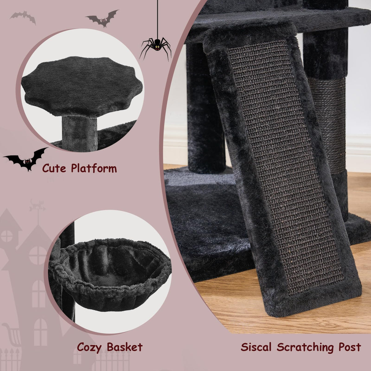 Bewishome Gothic Cat Tree With Coffin Bed Cat Tower For Indoor With Spacious Condo, Sisal Scratching Ramp, Cozy Basket Black Pet