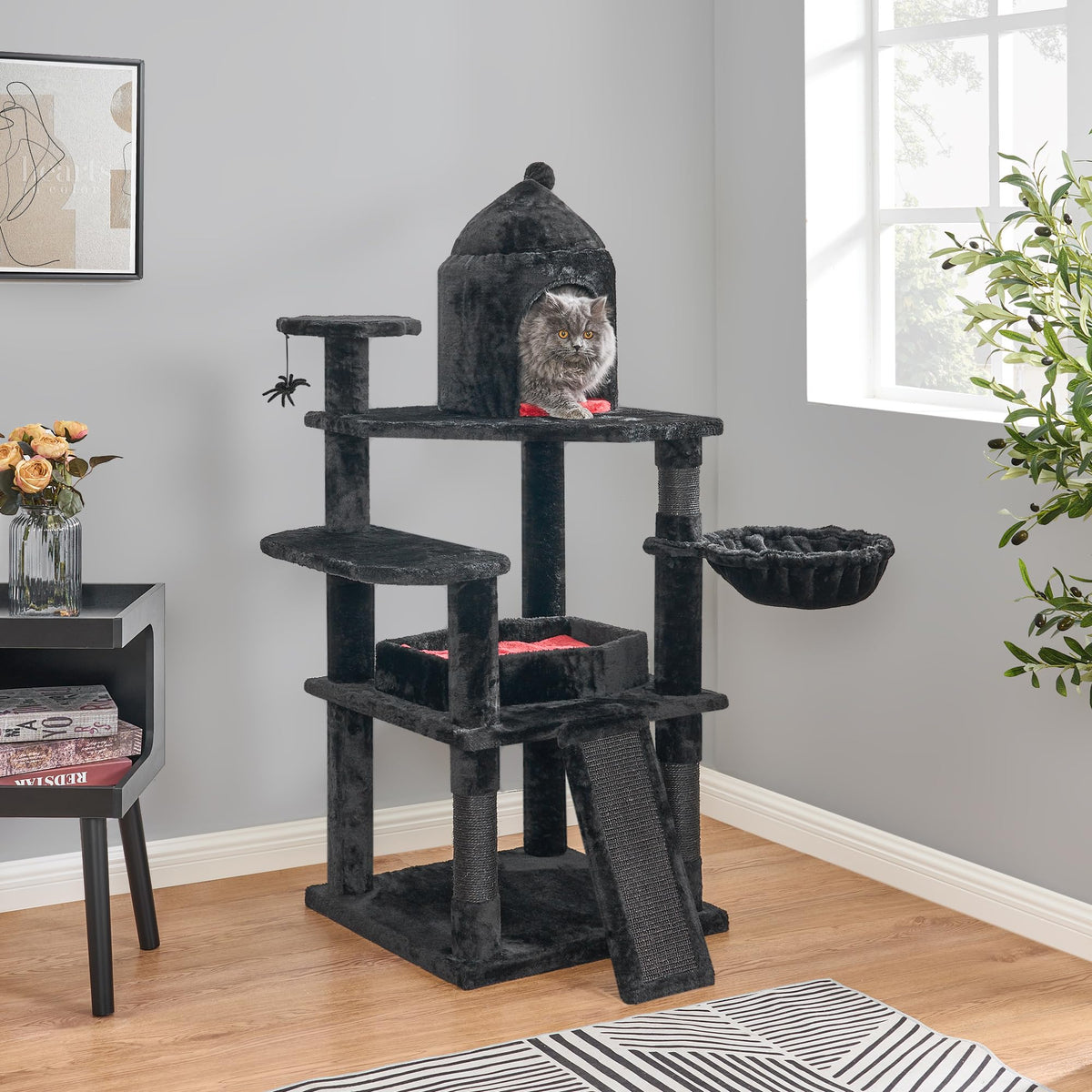 Bewishome Gothic Cat Tree Comes With Halloween Elemants Of Coffin Bed, Gothic Cat House, Plush Cover, Sisal Scratching Board And Posts And Cozy Hammock, Which Will Provide Your Pet Enjoyable And Comfortable Experience. Balance Design Will Ensure The Stable Of The Castle. Your Cats Will Love Their New House And Enjoy Themselves! Specifications: Color: Black. Material: Environmental Board + Plush Fabric Covering. Package Contents: 1 X Cat Tree 1 X Instruction Notes: Place The Cat Tree On A Flat Floor Against The Wall. Children Are Prohibited From Climbing And Playing On It.