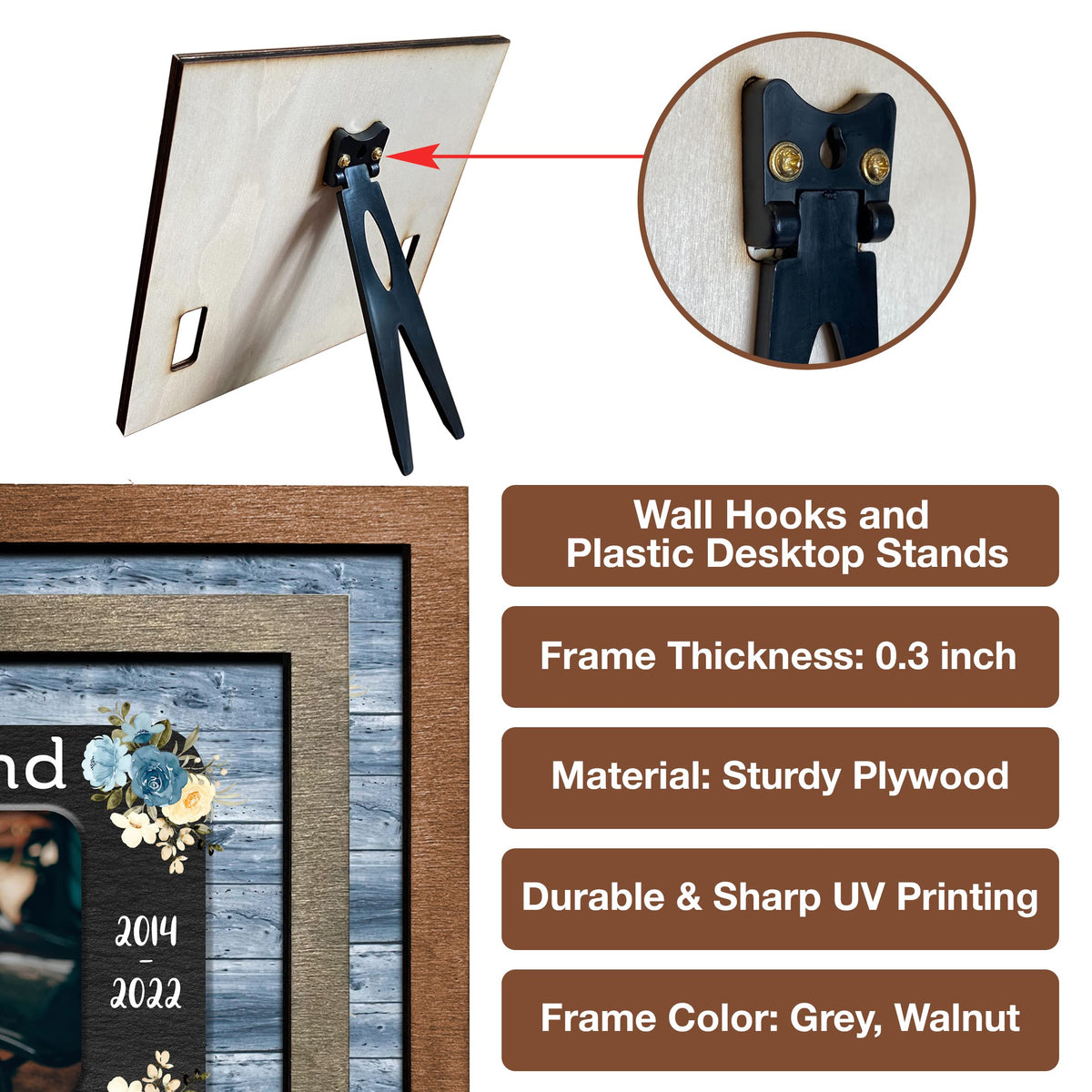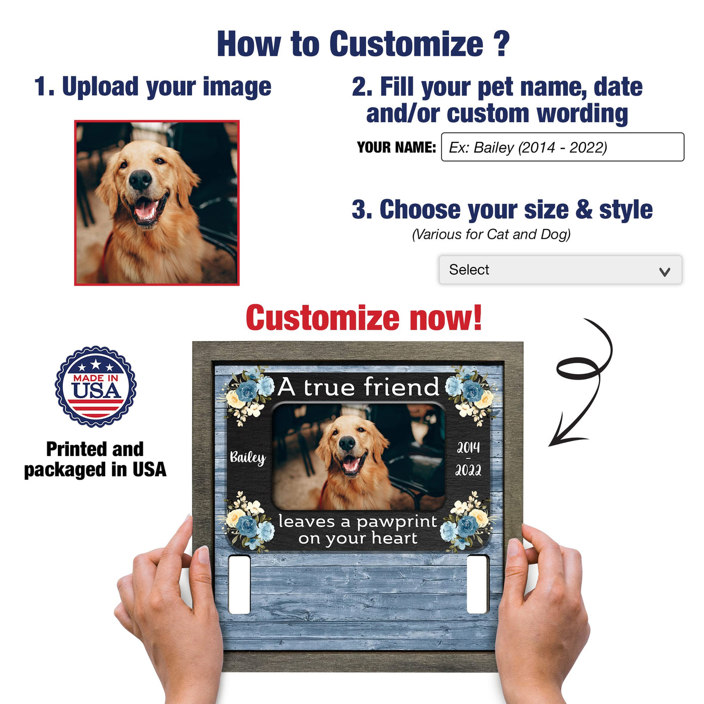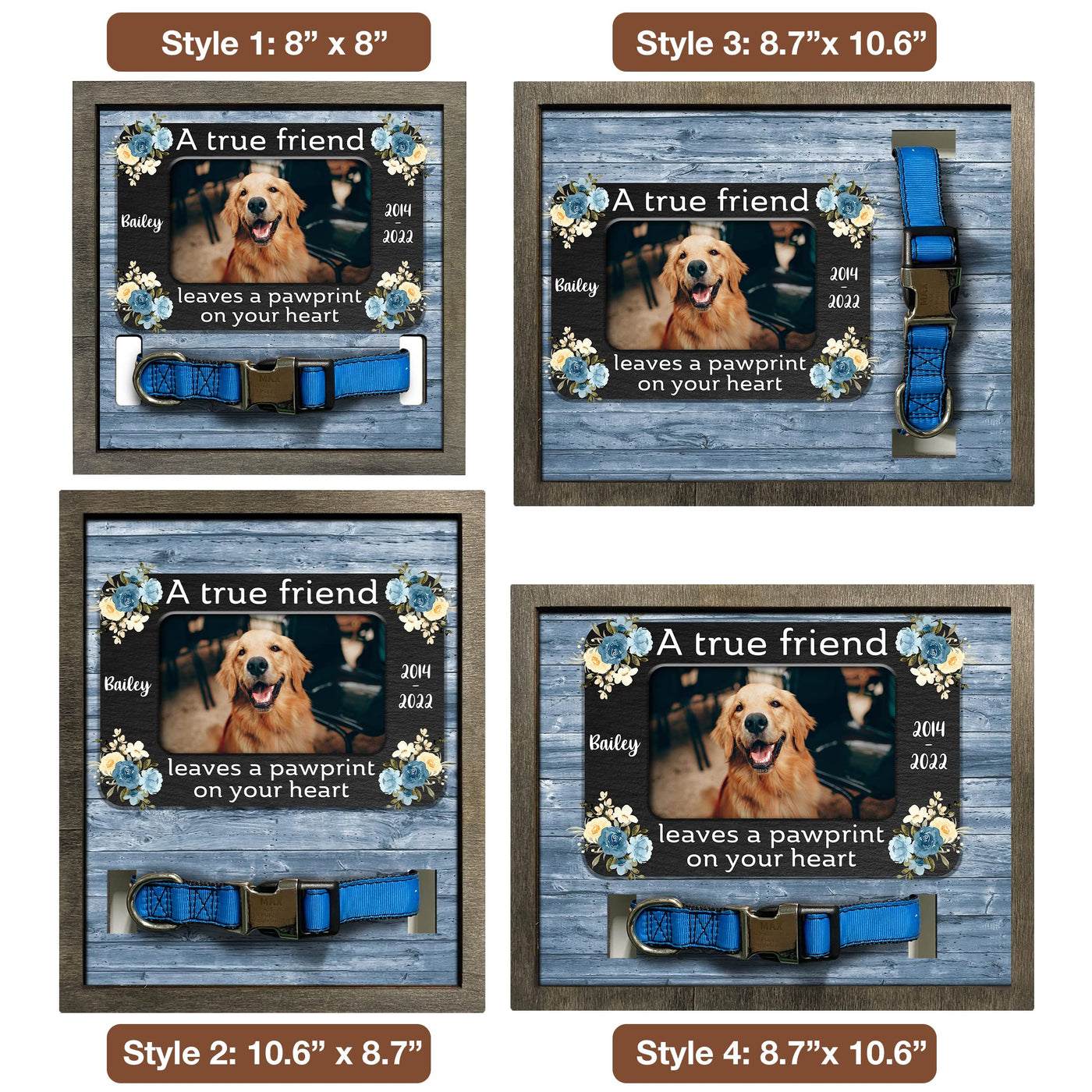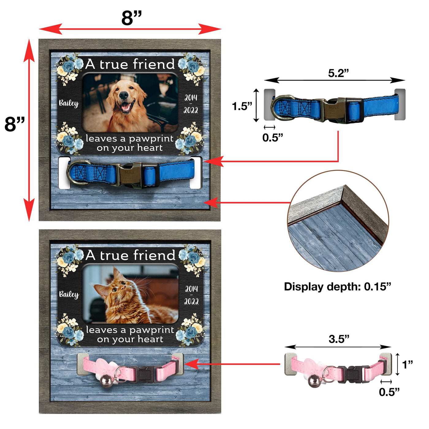 - 2 sizes: 8x8', and 8.7x10.6''. - 2 different color frame: Grey and Walnut. Each of our pet loss sign frames for the dog is very convenient for table decoration applications, pet memorial picture frames for home decors, hanging on the wall or pillar, or put on the table, mantle or shelf. It will make a beautiful pet remembrance item.The most prominent feature of our product is customized. You can have a beautiful keepsake to look at every day can help ease that grief a little bit. I believe that you will be happy and satisfied with our item. Also, your recipients will undoubtedly be pleased and emotional by your genuine care for them. Customer Service: Please contact us if you have any questions! We are always here to reply to all your questions you may have as quickly as possible. If you are unhappy with the gift for any reason, we will be ready to offer you a replacement or a 100% refund as long as our customers feel satisfied.