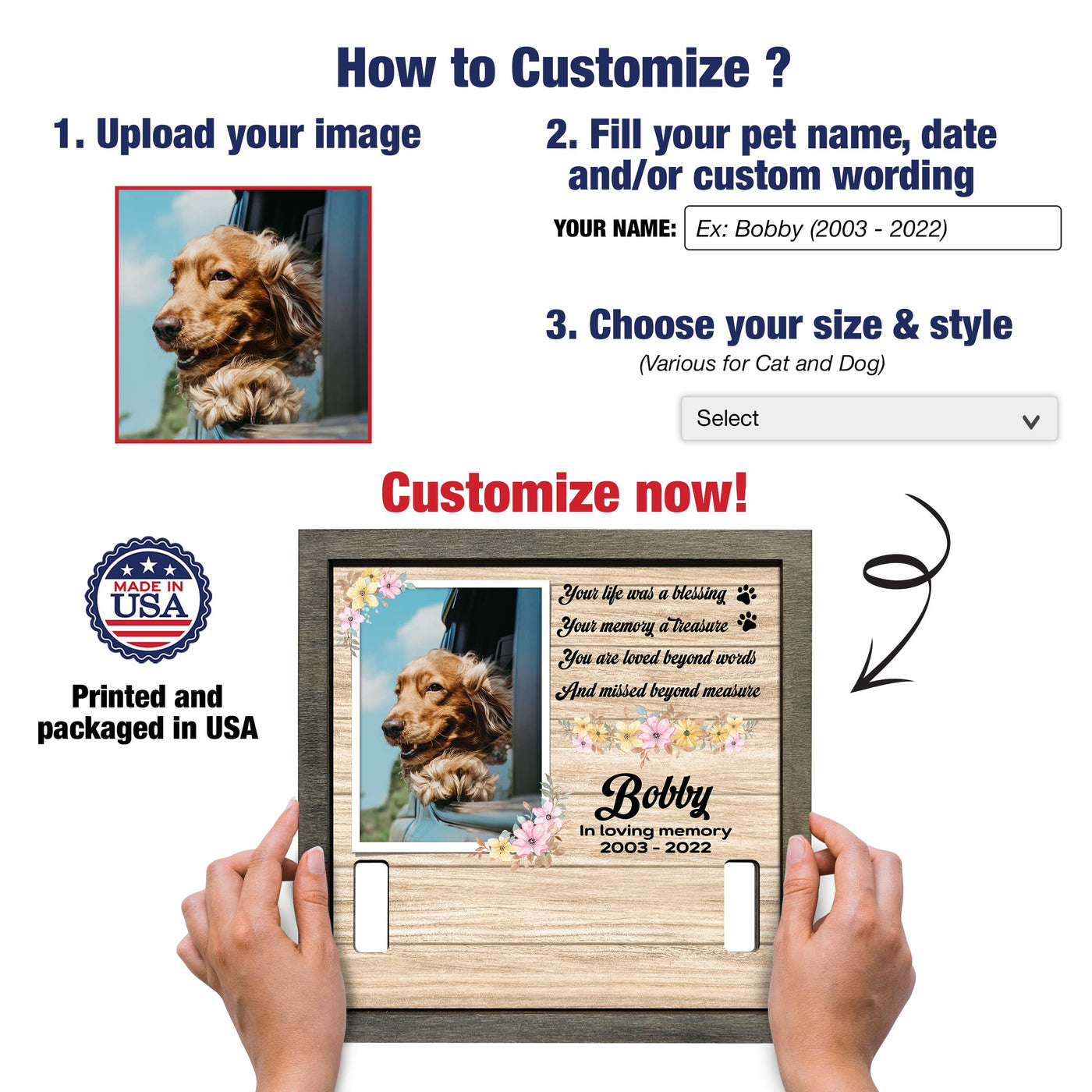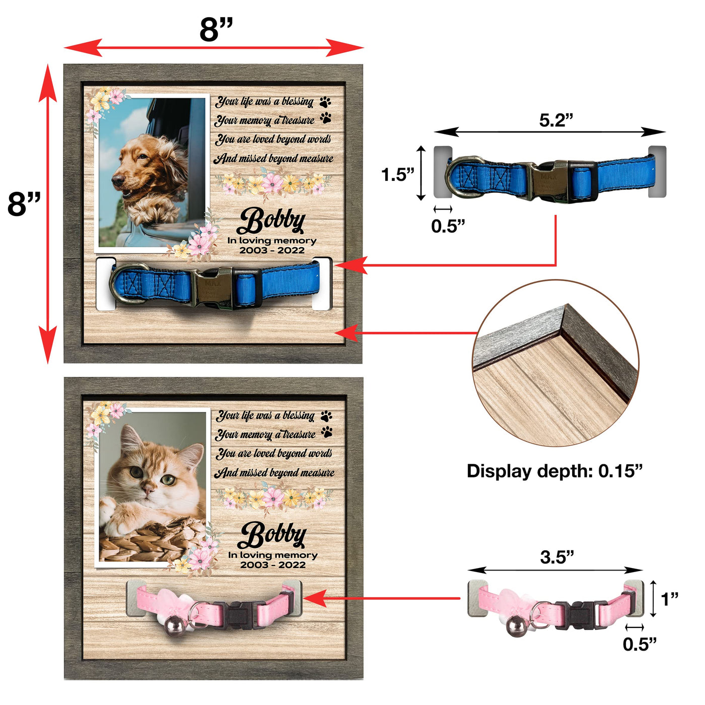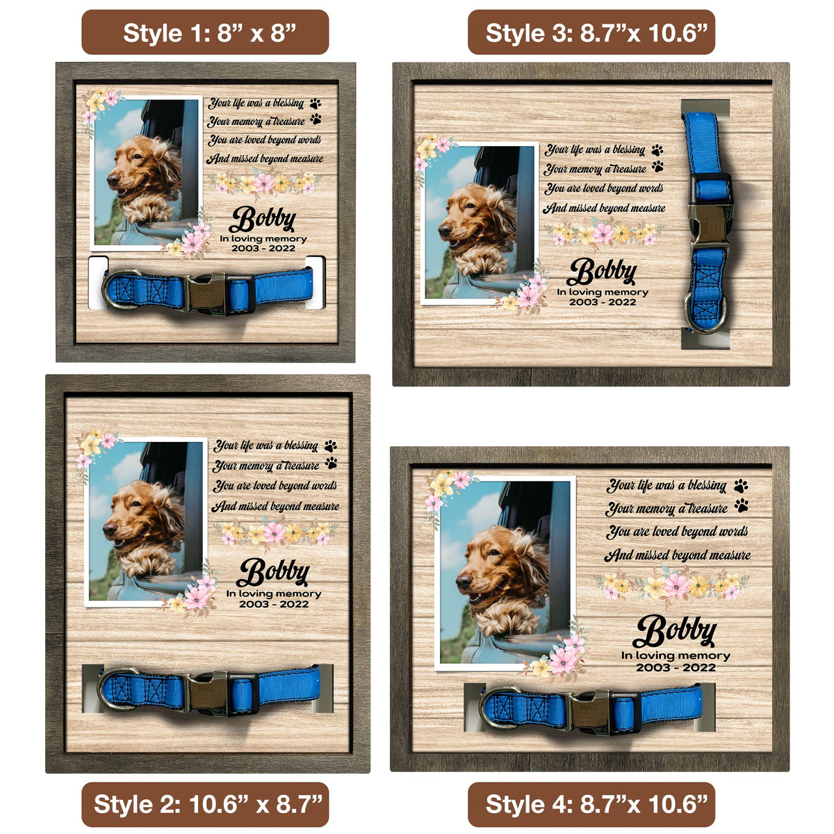 - 2 sizes: 8x8', and 8.7x10.6''. - 2 different color frame: Grey and Walnut. Each of our pet loss sign frames for the dog is very convenient for table decoration applications, pet memorial picture frames for home decors, hanging on the wall or pillar, or put on the table, mantle or shelf. It will make a beautiful pet remembrance item.The most prominent feature of our product is customized. You can have a beautiful keepsake to look at every day can help ease that grief a little bit. I believe that you will be happy and satisfied with our item. Also, your recipients will undoubtedly be pleased and emotional by your genuine care for them. Customer Service: Please contact us if you have any questions! We are always here to reply to all your questions you may have as quickly as possible. If you are unhappy with the gift for any reason, we will be ready to offer you a replacement or a 100% refund as long as our customers feel satisfied.