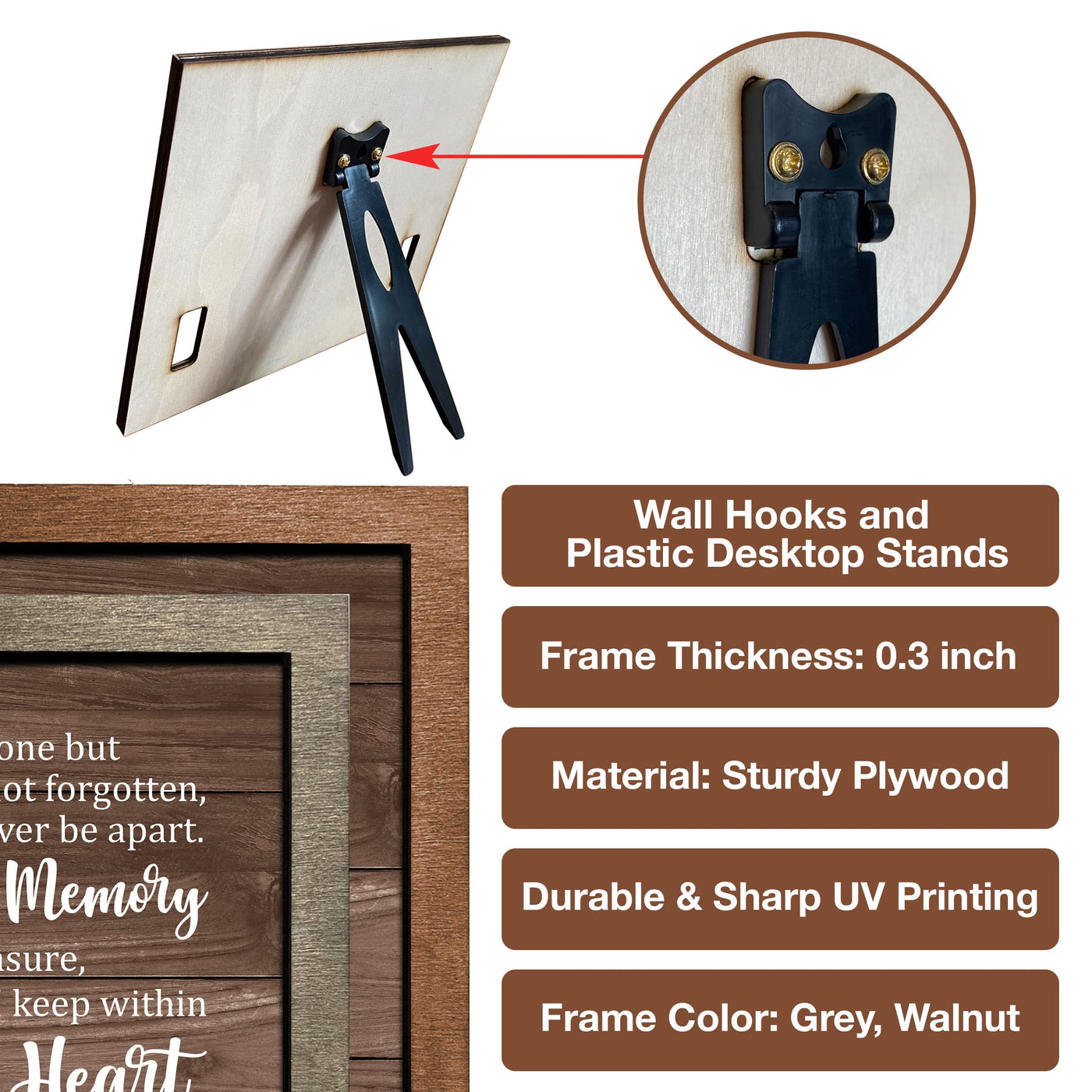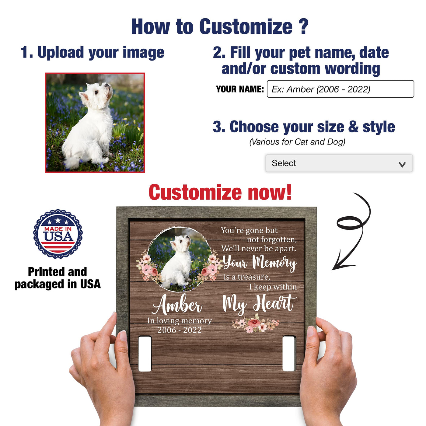 - 2 sizes: 8x8', and 8.7x10.6''. - 2 different color frame: Grey and Walnut. Each of our pet loss sign frames for the dog is very convenient for table decoration applications, pet memorial picture frames for home decors, hanging on the wall or pillar, or put on the table, mantle or shelf. It will make a beautiful pet remembrance item.The most prominent feature of our product is customized. You can have a beautiful keepsake to look at every day can help ease that grief a little bit. I believe that you will be happy and satisfied with our item. Also, your recipients will undoubtedly be pleased and emotional by your genuine care for them. Customer Service: Please contact us if you have any questions! We are always here to reply to all your questions you may have as quickly as possible. If you are unhappy with the gift for any reason, we will be ready to offer you a replacement or a 100% refund as long as our customers feel satisfied.