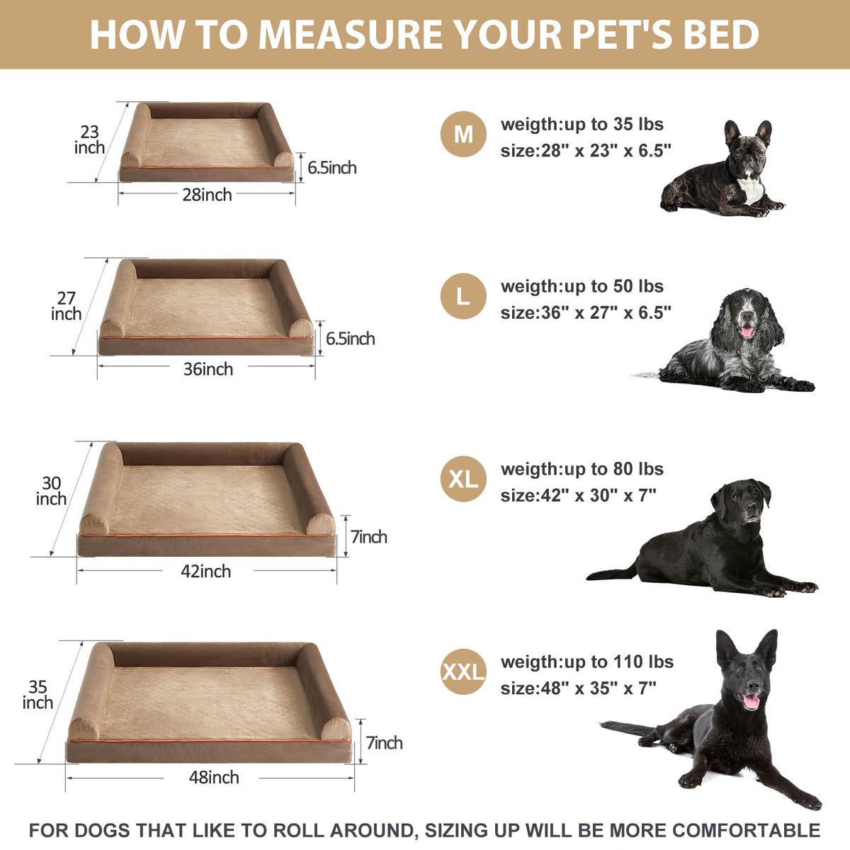 MADE FOR cOMFORT: 3 inch high density egg crate foam orthopedic dog bed supports your fur babys muscles and joints relieves joint pain a great choice for elderly or sick dog pets they will love a day in the large dog bed cOZY ROSE PATTERN PLUSH: The sleeping surface of the large size dog bed features luxurious rose pattern plush soft and cozy plush provides a calming and anti-anxiety feel allowing pets to fall into a deep sleep faster and gentle on the pets nose and paw SOFA DOg BED DESIgN: The washable large dog bed is designed with U-shaped 3 side 35 inch side pillow provide extra support for your pets neck and head allowing pets to rest better in the dog bed The fence-like design makes the puppy feel more secure lying in it DIMENSIONS (DOg BEDS FOR MEDIUM DOgS): large Dog Bed 36 x 27 x 65 (35 bolstered side ) for medium and large dogs up to 60 lbs If you want more space for your pet it is recommended to choose a size up WATERPROOF DOg BED & REMOVABLE DOg BED: The 3 side zippers on the dog bed cover make it easier to remove or put together for quick cleaning and easy care Arrives in a vacuum-packed box unpack and leave in air for 24 hours the dog bed will spring back and fill up
