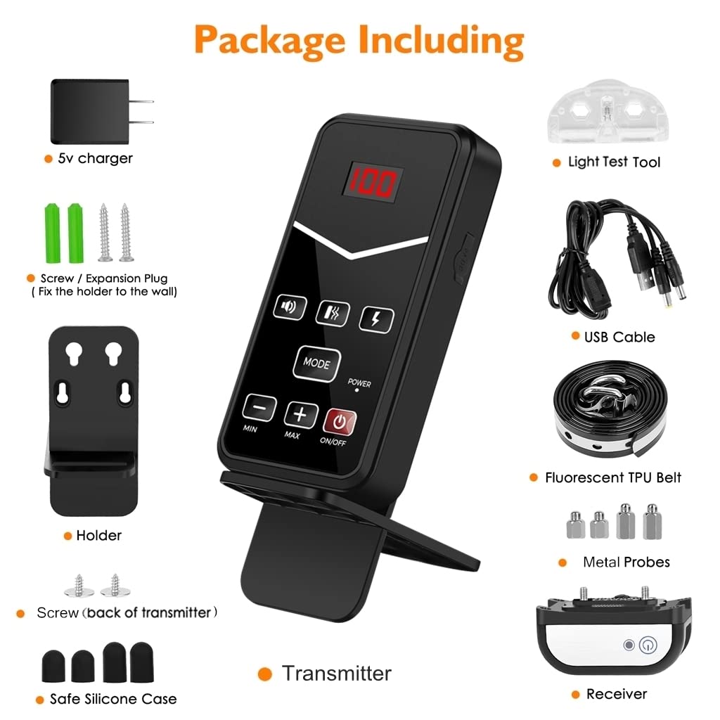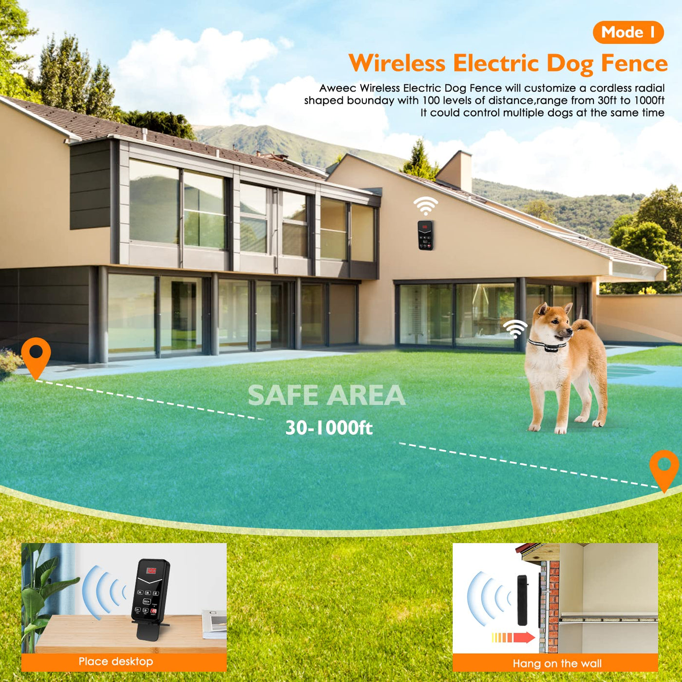 Intelligent Newest Electric Fence] BHcEY Intelligent Electric Fence System combines function of Wireless Dog Fence and Remote Training collar Aweec adopted the most advance 24g signal resources which provide much more stable and accurate signal transmission to avoid your dog be shocked accidentally caused by the bad signal Help to train your pet and shape good habits safety Wireless Fence Mode] Under Wireless Fence Mode one transmitter can connect with several receiver collars You do not need to manually pair them they will be connected automatically after power on Stable signal range from 30ft to 1000ft in radius When your dog is out of range the receiver collar will make a warning tone - vibration and then a 37V low voltage mild electrostatic shock will remind your dog to go back Remote Training Mode] Under Training collar Mode it can control 3 dogs at the same time There are 3 functions could be chosen from the panel directly: Sound Vibration & ShockVibration and Shock have 3 intense levels to adjust come with 4 pcs conductive posts 2 small ones for short hair dogs 2 large ones for long hair dogs as well as extra 4pcs of Silicone caps which will protect dog hairs Rechargeable & Adjustable] Both of the transmitter and receiver collar are rechargeable The transmitter needs 4-5 hours and the receiver just needs 1-2 hours to be fully charged Battery can last for several weeks you could take it out to anywhere you need The collar belt is adjustable with the size ranges from 8 to 28 inches which makes it suitable for all size of dogs (10 to 110 pounds) Also it is made of reflective fluorescent TPU material which improves the safety of dogs at night Unique Holder & Waterproof] BHcEY designed a special multi-function holder which will hold the transmitter both on the desk or hanging on the wall we suggest to place the wireless dog fence transmitter 5 feet above ground at least To avoid the signal disturb please hanging on the wall for the best signal transmission Both electric fence transmitter and receiver collar is made of IP65 waterproof material it means your dog can get wet in the grass mess with the sprinkler or play in the rain