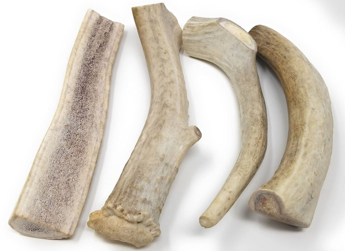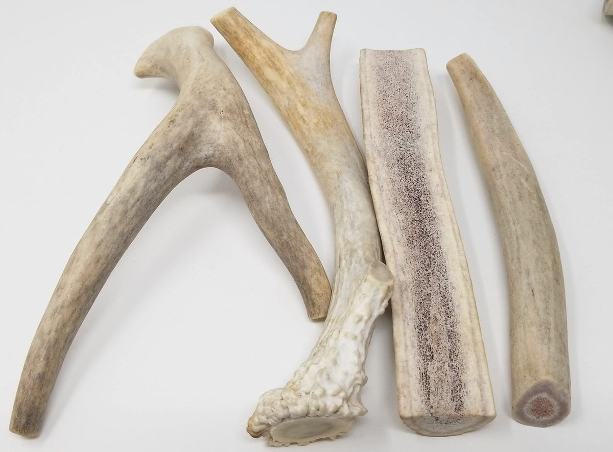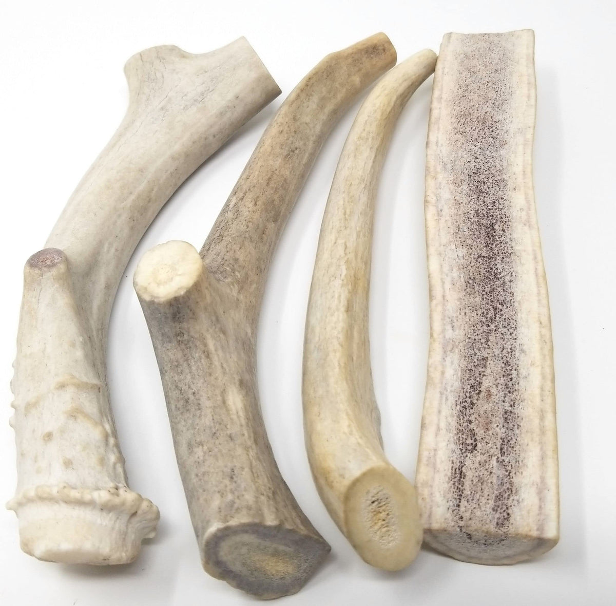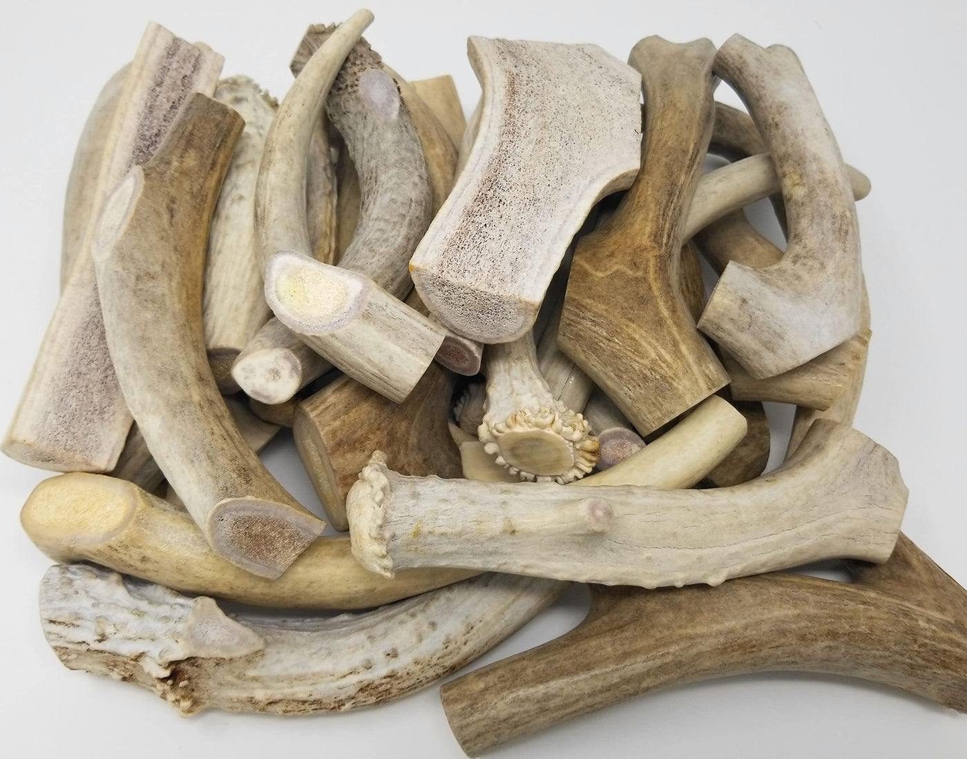Why are Big Dog Antler Chews such great chews for your dog? Antlers are one of the most easily digested forms of calcium available and are regularly consumed by wildlife such as squirrels, skunk, raccoon and mink. Since our antlers are never farm raised they never contain steroids, antibiotics, preservatives or any artificial additives. Deer and Elk antlers do not tend to chip or splinter like some cooked and raw bones do. Why are Big Dog Antler Chews Different? These are Sun-Aged, B-Grade antlers. They are great for dogs who are not aggressive chewers. These antler pieces are each at least 6 long, and will last your dog a long, long time! Each 1 pound package will contain 4 or more deer or elk antler pieces, depending on weight. Each package will contain at least one split antler. The pictures are to show the variety of shapes, colors and sizes of the antler pieces. Our antlers are from free ranging wild elk and deer. They are a fantastic natural source of calcium, phosphorus, manganese and zinc. Great source of tartar control for your dogs teeth. They are perfect for indoors - Extremely long-lasting and create no stinky, sticky, greasy mess on your floor or on your hands. You and your dog must be 100% satisfied with our dog Antler Chews or we will refund your money - GUARANTEED!!! Make your dog happy today - Click on the BUY NOW Button above!