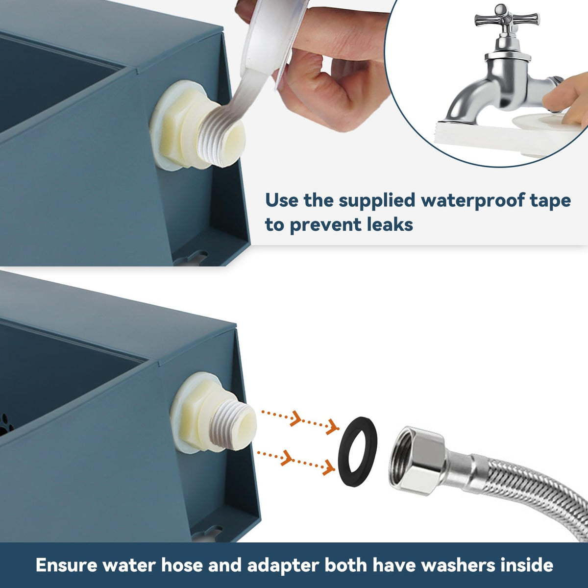 Check The Components: Ensure That All Parts Are Included In The Package, Including The Water Hose, Adapter, And Waterproof Tape. Install Steps: 1.Install The Adapter To 3/4 Ght Faucet: Before Installing, Make Sure To Use The Supplied Waterproof Tape To Seal The Faucet Interface And Prevent Leaks. 2. Connect One End Of Water Hose To The Adapter, Ensuring A Secure Connection. 3. Connect Another End Of Water Hose To Bowl The Water Inlet Of The Automatic Water Bowl, Ensuring The Connection Is Tight. Tips To Prevent Water Leaks: 1. Make Sure The Water Hose And The Adapter Both Have Washers Inside, The Washers Role Is To Seal The Connection And Prevent Leakage. 1.Use The Provided Waterproof Tape To Reinforce The Connection At The Faucet To Improve The Seal And Avoid Leakage. 2.Ensure Each Connection Is Tightly Secured. 3.After Connecting, Always Check The Stability Of The Hose And Fittings To Ensure There Is No Water Leakage While The System Is In Use.