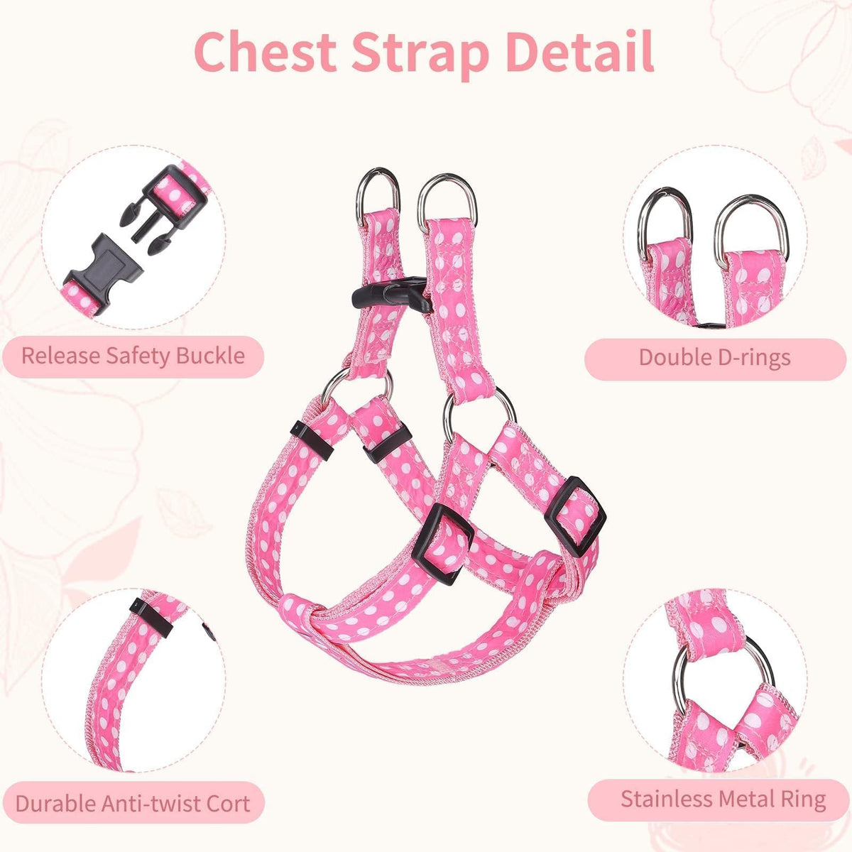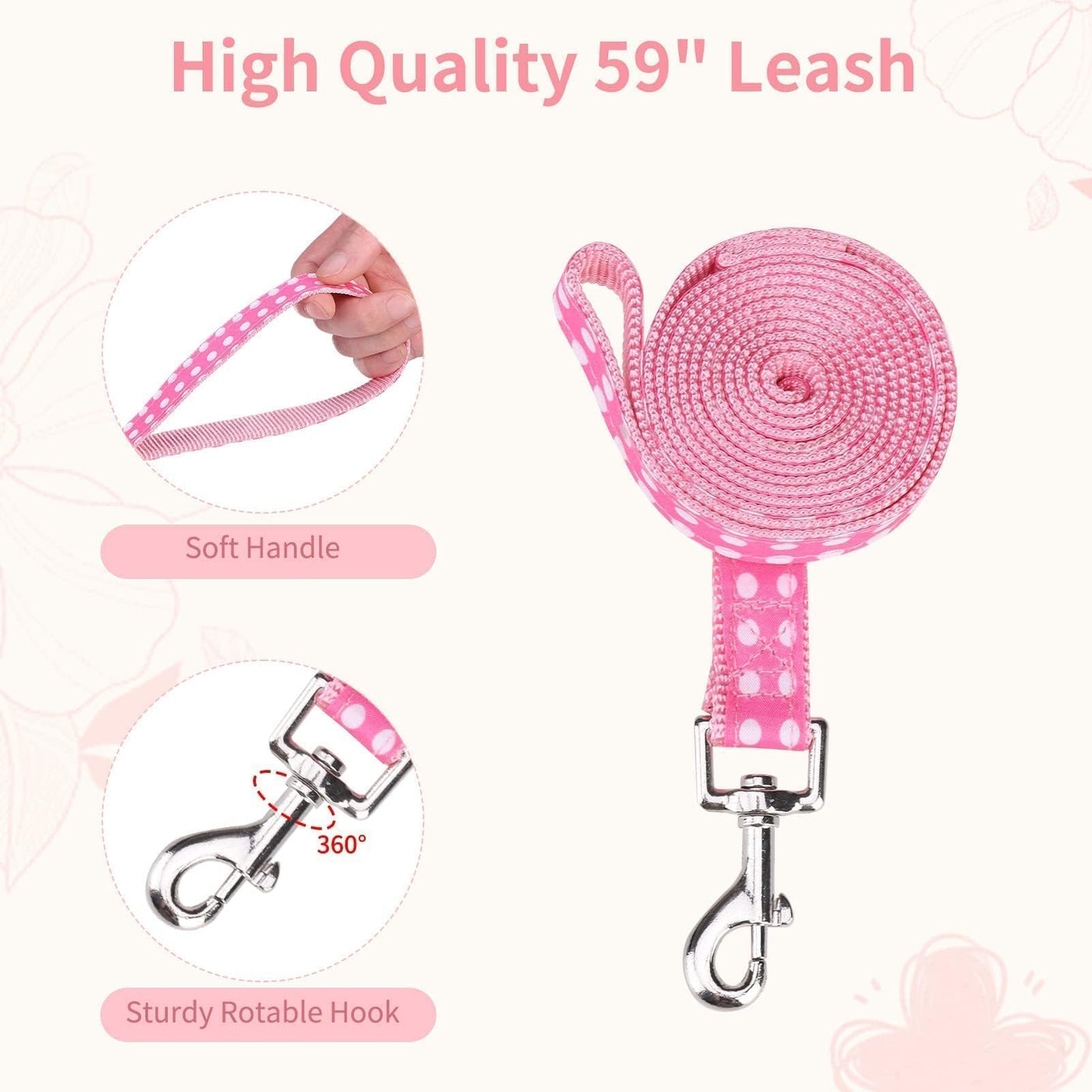 Size S: Harness chest girth: 149 - 202 collar adjustable 118 - 157 leash length: 59 Please measure your dogs size before ordering Package: Halter harness * 1 dog collar with bowtie * 1 leash * 1 It is recommended to check whether it is complete after receiving itIf you have any questions please contact customer service Designed with polka dot pattern never outdated and made of high quality material which is soft and durable Escape Proof: The double heavy duty D ring design on the harness can make the leash connection more stable and safer Enjoying outdoor walking with the harness bowtie collar and leash set fit for small to large dogs