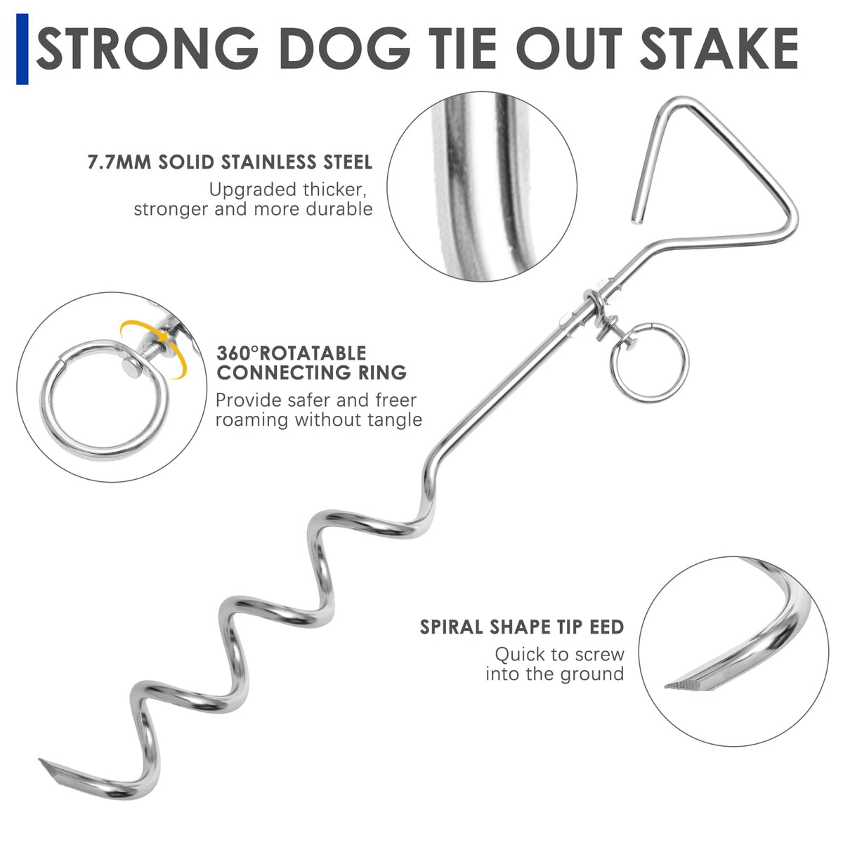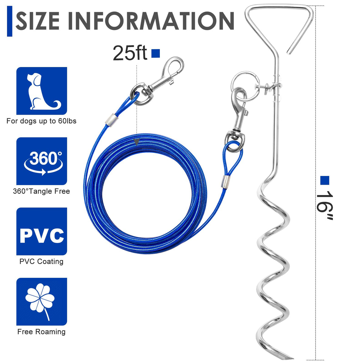 Includes 25-feet long tie-out cable and 16-inch stake up to 60 lbs dogs Easy to install screw it into the ground and attach the collar to the cable Double 360 degree swivel rings reduces cable tangling you dog will forget the cable Perfect size for small to medium dogs heavy duty cable for better play Keeps your dog safe in the yard and park gives your pet enough length to play