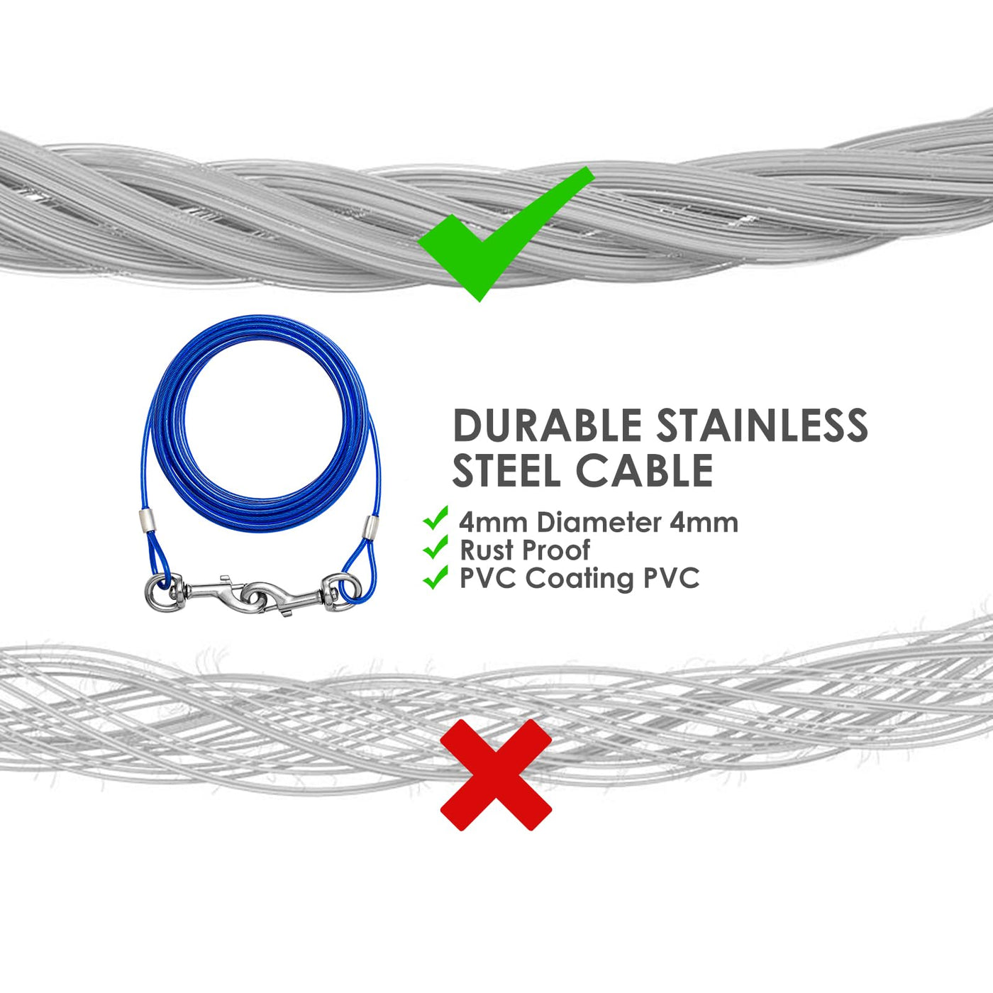 Q: How long is the dog tie out cable, and what materials are used?A: The dog tie out cable measures 25 feet in length and is made of 4mm braided stainless steel wire rope, ensuring high tensile strength and durability, with a weatherproof PVC protective coating.
