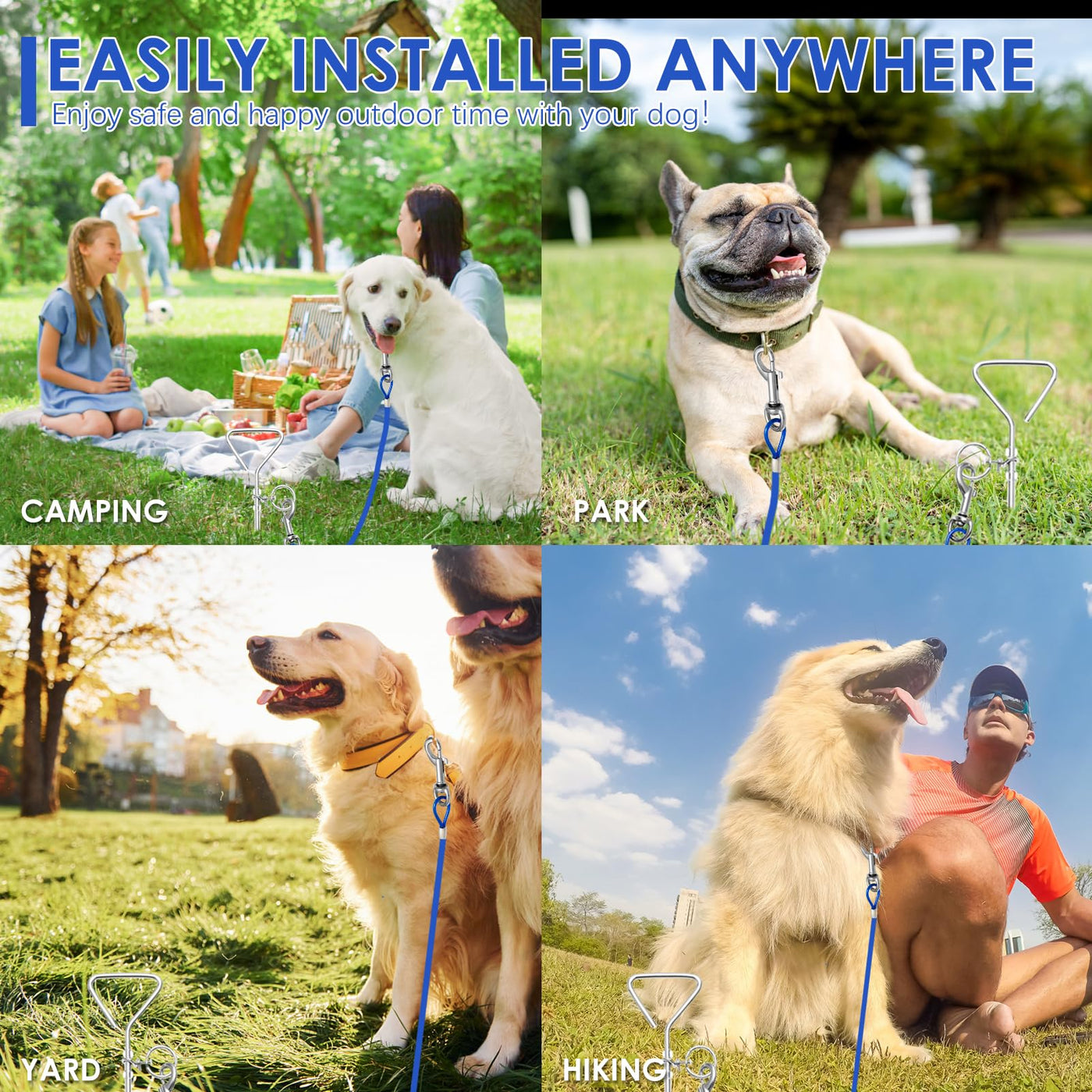 Q: Can the tie out cable be used in different outdoor environments?A: Absolutely! The BINGPET Dog Tie Out Cable and Stake is perfect for various outdoor environments, including yards, parks, beaches, and during camping trips, allowing your dog to roam safely.