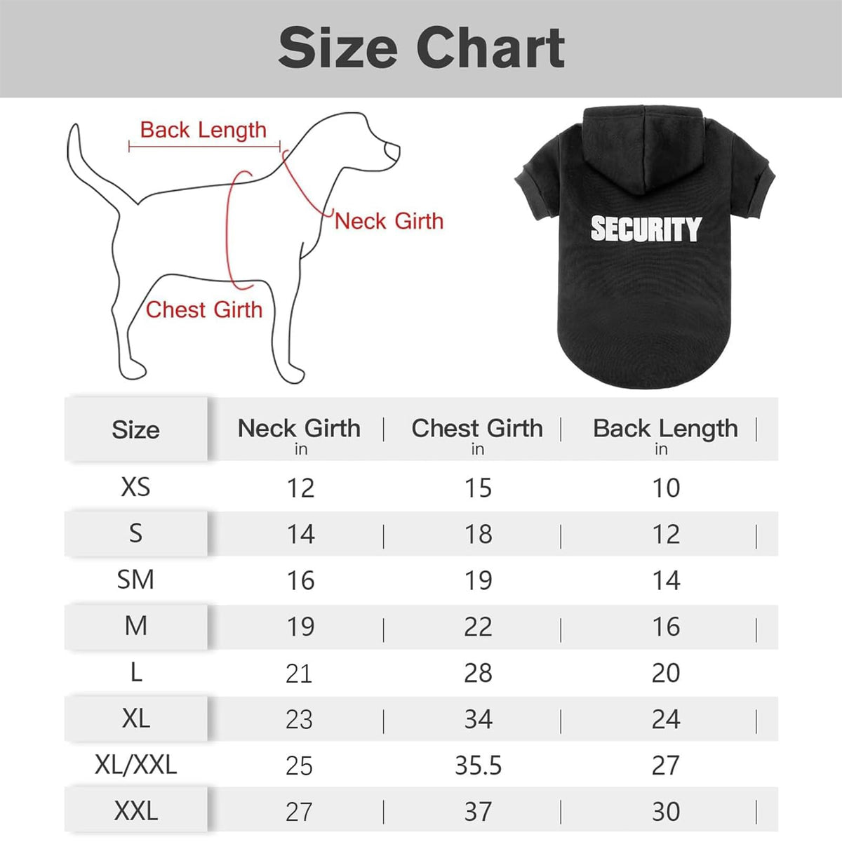 [MULTI-SIZES]: This pet hooded sweatshirts comes in 6 sizes which can fit almost dogs. Please follow the size chart to find a perfect size for your pet,a looser size will be more cozy. Large -- Neck Girth:21' Chest Girth:28', Back Length:20'. | [UPGRATE DESIGN]: The letters on the back of the sweater are not easy to fall off because of the upgraded glue pressing technology.This greatly increases the durability of the dog hoodie. | [STYLISH DESIGN]: The dog in the hoodie looks more attractive and mysterious, you can walk a powerful police dog with you on street, cool and eye-catching. Also the ribbed sleeves and waist ensure a snug fit, provide your dog better feeling. | [EASY TO CLEAN]: Both machine and hand wash are okay, super convenient for every pet parent, we suggested the low-level mode for cleaning and low temperature for drying while machine cleaning. | [ULTRA SOFT & WARM]: Fleece fabric is to provide your pet the ultimate warmth when the temperature begins to drop and minimizing heat loss.