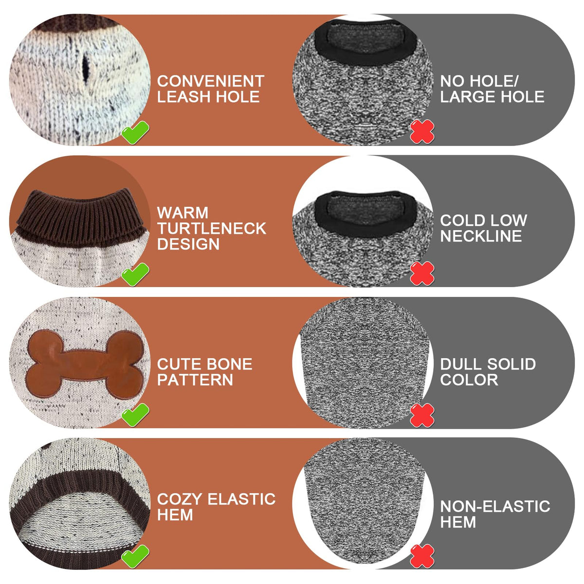 [SUPER WARM AND COMFY]: Our dog sweater is very cozy and warm. Especially the thick turtleneck type offers extra warmth to the neck. Your pet would love it and willing to wear it even sleeps in it on cold nights even won 't willing to go outside without it.