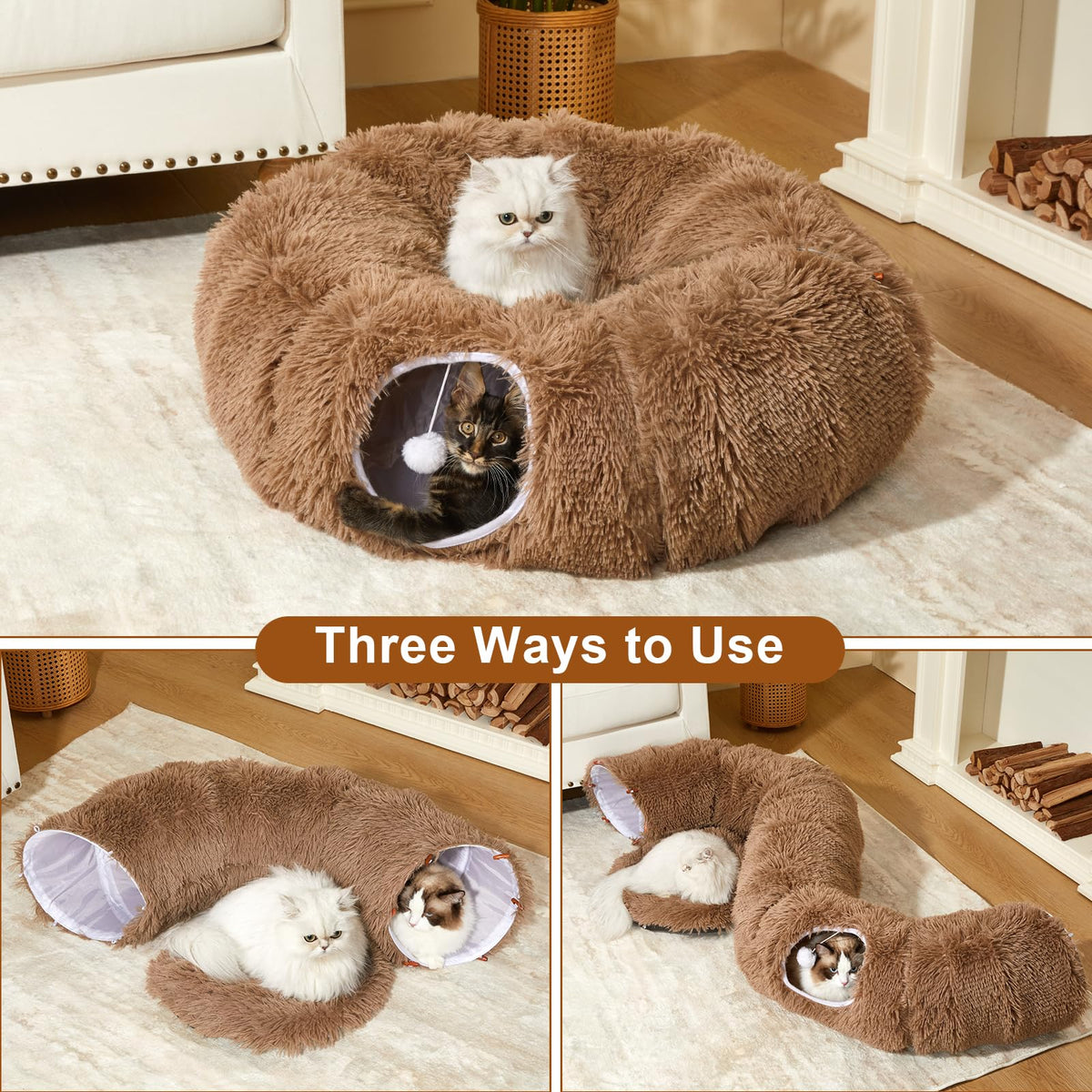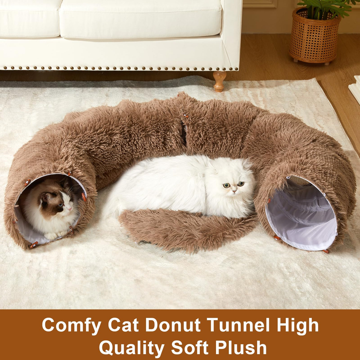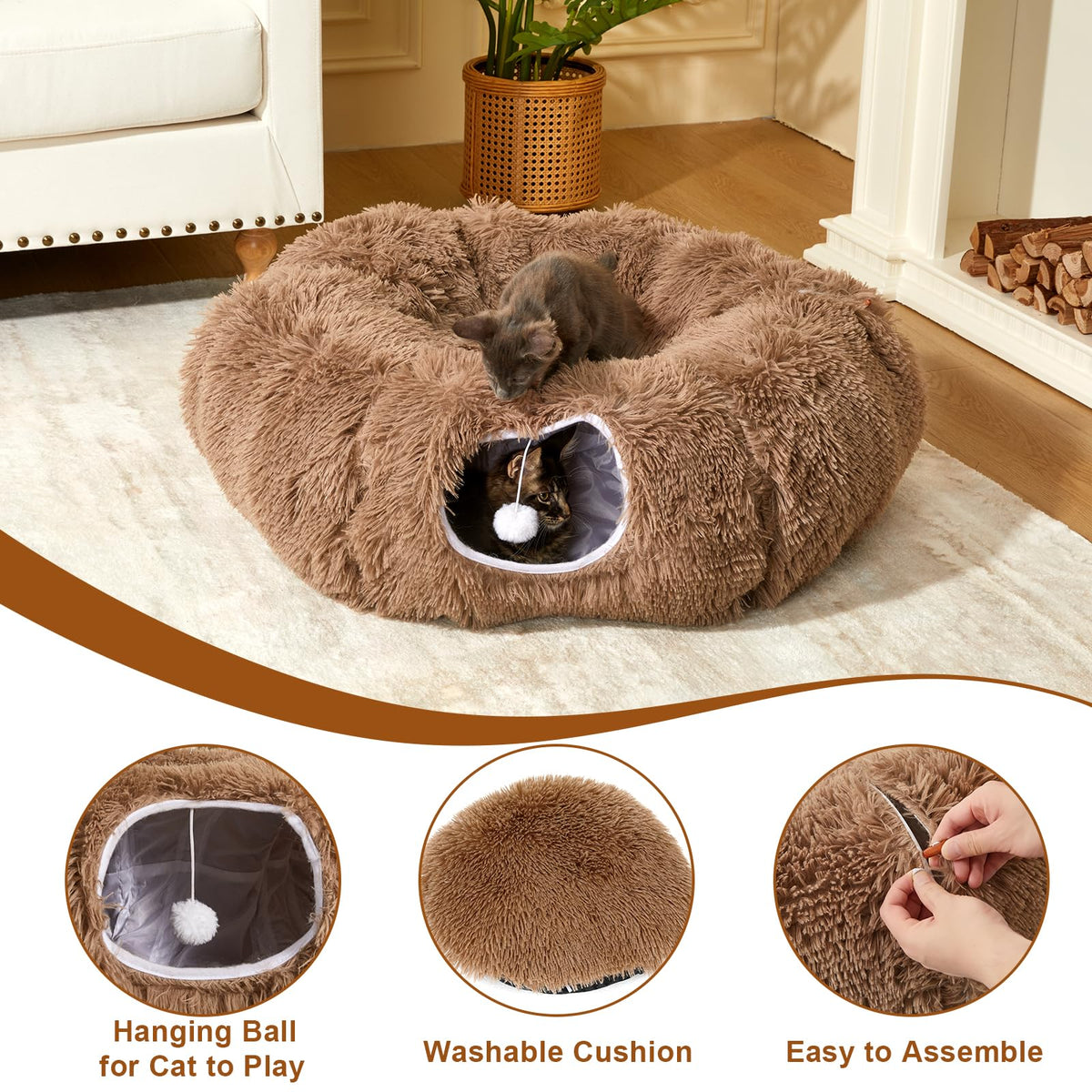 Bininl Cat Tunnel Bed For Indoor Cats Peekaboo Cave Donut With Washable Circle Cushion Interior Cat Play Tunnel (34 Inch, Brown)