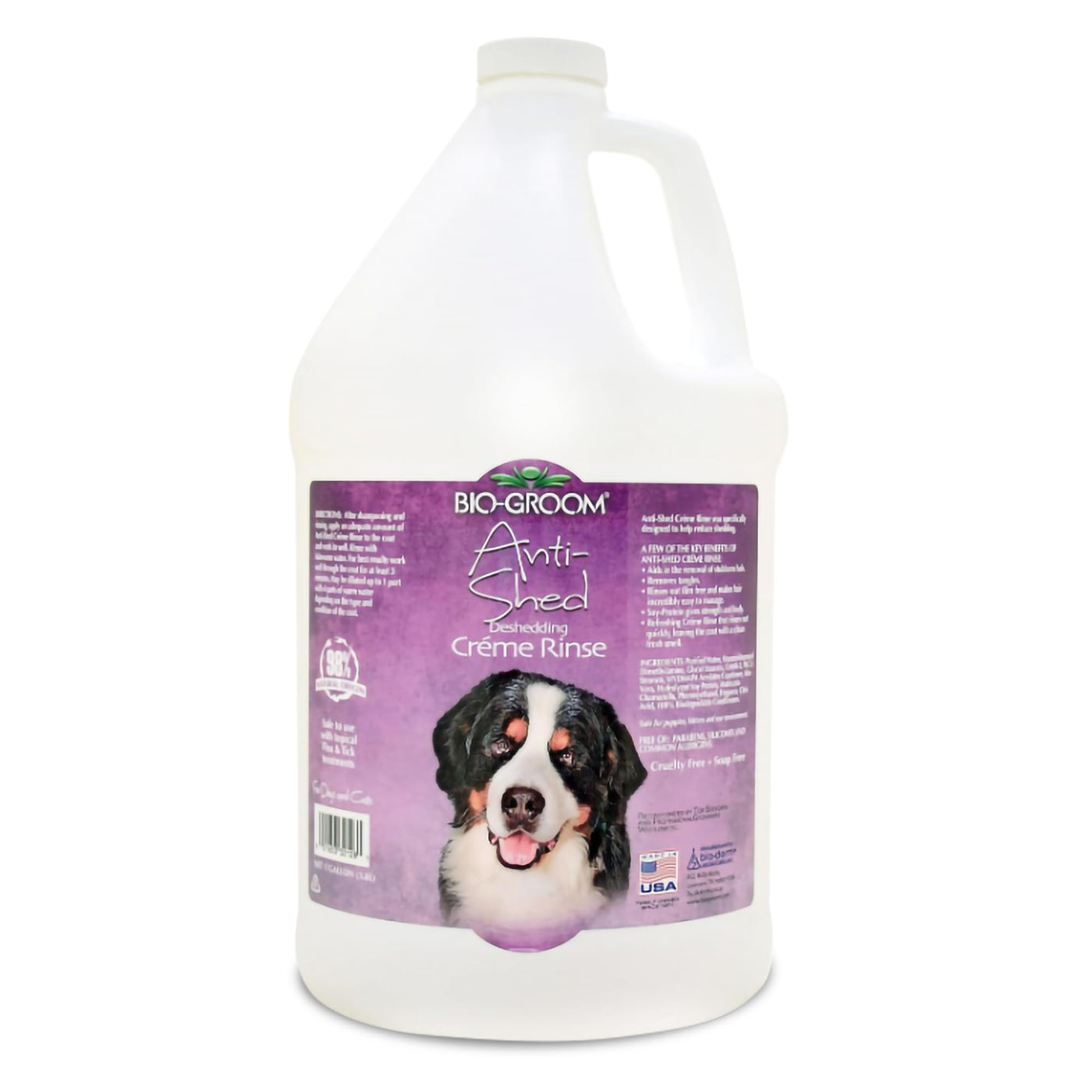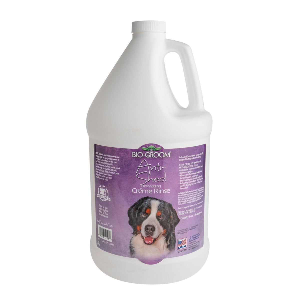 Bio-Groom Anti-Shed Deshedding Dog Cr?me Rinse is a high quality natural dog conditioner specifically developed to help reduce shedding. This cr?me rinse is great for double coated and long-haired breeds to keep their shedding down. It grips the loose coat and removes stubborn hair and loose undercoat during bathing to cut down on brushing and grooming as a whole. Anti-Shed Cr?me Rinse also removes tangles! This dog shedding conditioner reduces the amount of extra brushing for double coated or long hair breeds. The removal of loose hair decreases the chance of matting and hot spots. Anti-Shed Cr?me Rinse rinses out quickly and film-free leaving the coat easy to manage and with a clean fresh smell. It can and should be used all year but customers will see the greatest benefits during weather changes. This deshedding conditioner for dogs is free of parabens silicones and common allergens. It is cruelty free soap free and has 100% biodegradable conditioners. Additionally the Soy Protein formula gives strength and body to the coat. Anti-Shed Cr?me Rinse is safe for puppies kittens the environment and safe to use with topical flea and tick treatments. Recommended by top breeders and professional groomers worldwide.Anti-Shed Deshedding Cr?me Rinse is specifically designed to help reduce sheddingAids in the removal of stubborn hair and loose undercoatDecreases the amount of extra brushingCuts down grooming timeReduces likelihood of mats and hotspots