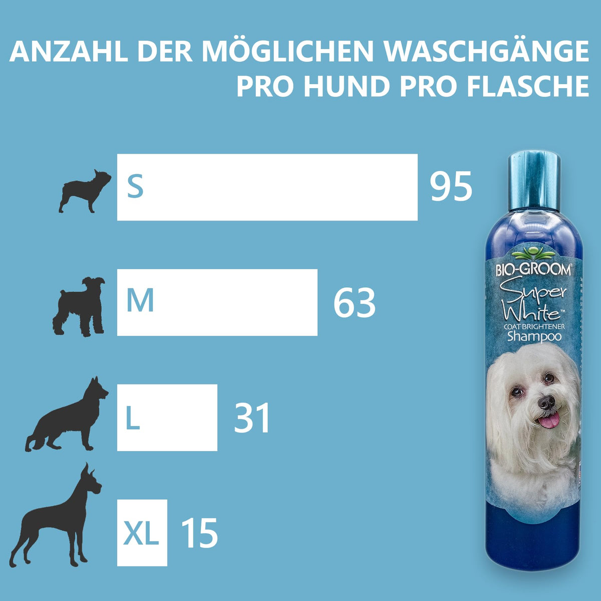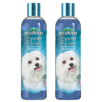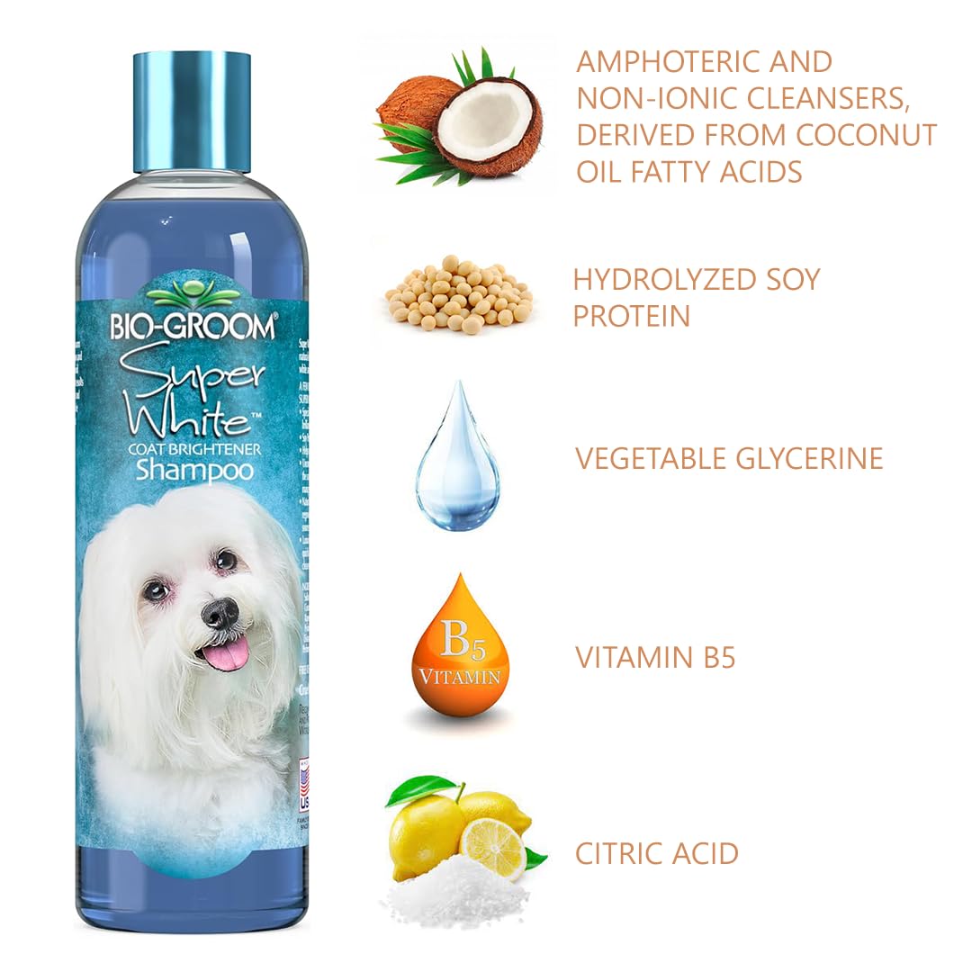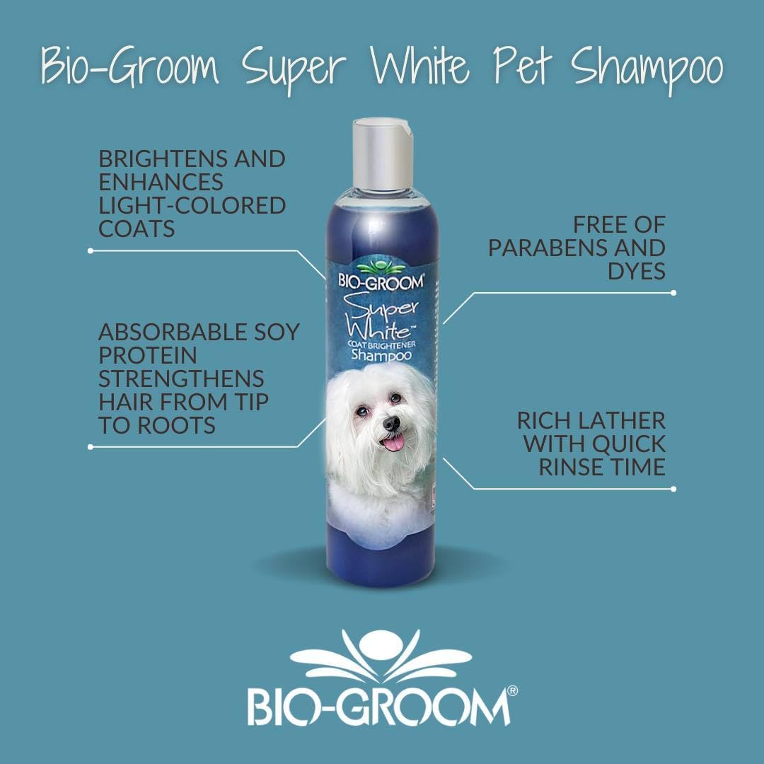 Tearless, coat-brightening Bio-Groom super white shampoo makes white coats sparkle without bleaching. Designed to enhance white and light-colored coats, the rich formula cleans thoroughly while adding luster and body to coats. Controls matting and leaves hair smooth, manageable and shiny. Bio-Groom super white shampoo is fortified with protein and leaves a fresh, clean scent. Dilutes 4:1. Comes in a 12 ounce. Ingredients are Cleaners derived from coconut oil, a biodegradable & regrowable source. Hydrolyzed protein, elegant floral fragrance. Directions for use - Wet the coat with warm water, Rinse. Apply shampoo and work well through the coat. For best results shampoo and rinse again, then dry and groom as usual. Measures 8-inch length by 2-2/7-inch height by 2-2/7-inch width.