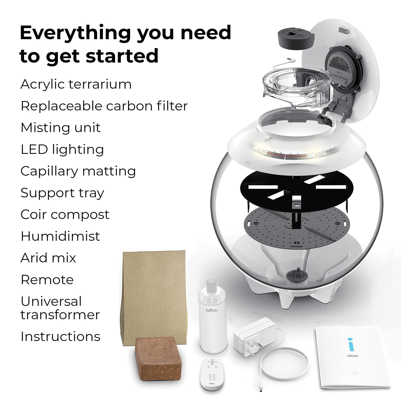 Introducing THE ultimate terrarium for plant enthusiasts, the biOrb AIR 30. Showcase and grow your choice of plants in this fully automated terrarium. Use the included remote control to choose between three settings: low for semi-arid plants, moderate for temperate plants with no specific needs, and high for tropical plants. Its compact size is perfect for desktop or tabletop display. The AIR 30 senses when the humidity drops and gently mists and circulates air to stay within the selected relative humidity range. The array of LEDs provides perfect lighting, mimicking natural daylight, promoting natural growth, and preventing plant bending. Use the remote to control the brightness or pick an 8-hour, 10-hour, 12-hour, or 14-hour light cycle, with each cycle simulating sunrise, daylight, dusk, and nighttime. Enjoy a 360-degree view of your mini paradise through the unique shape, made from durable acrylic. The AIR 30 comes complete with everything needed to get started, just add plants!