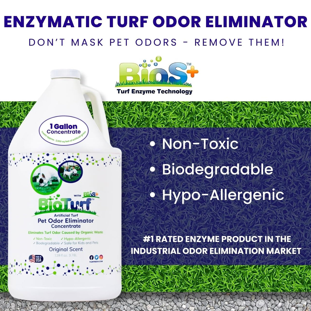 Q: How does the BioTurf BioS+ Artificial Turf Pet Odor Eliminator work?A: The BioTurf BioS+ utilizes an all-natural enzymatic formula that breaks down ammonia and proteins responsible for pet odors. This process eliminates unpleasant smells instead of merely masking them, ensuring long-lasting freshness.