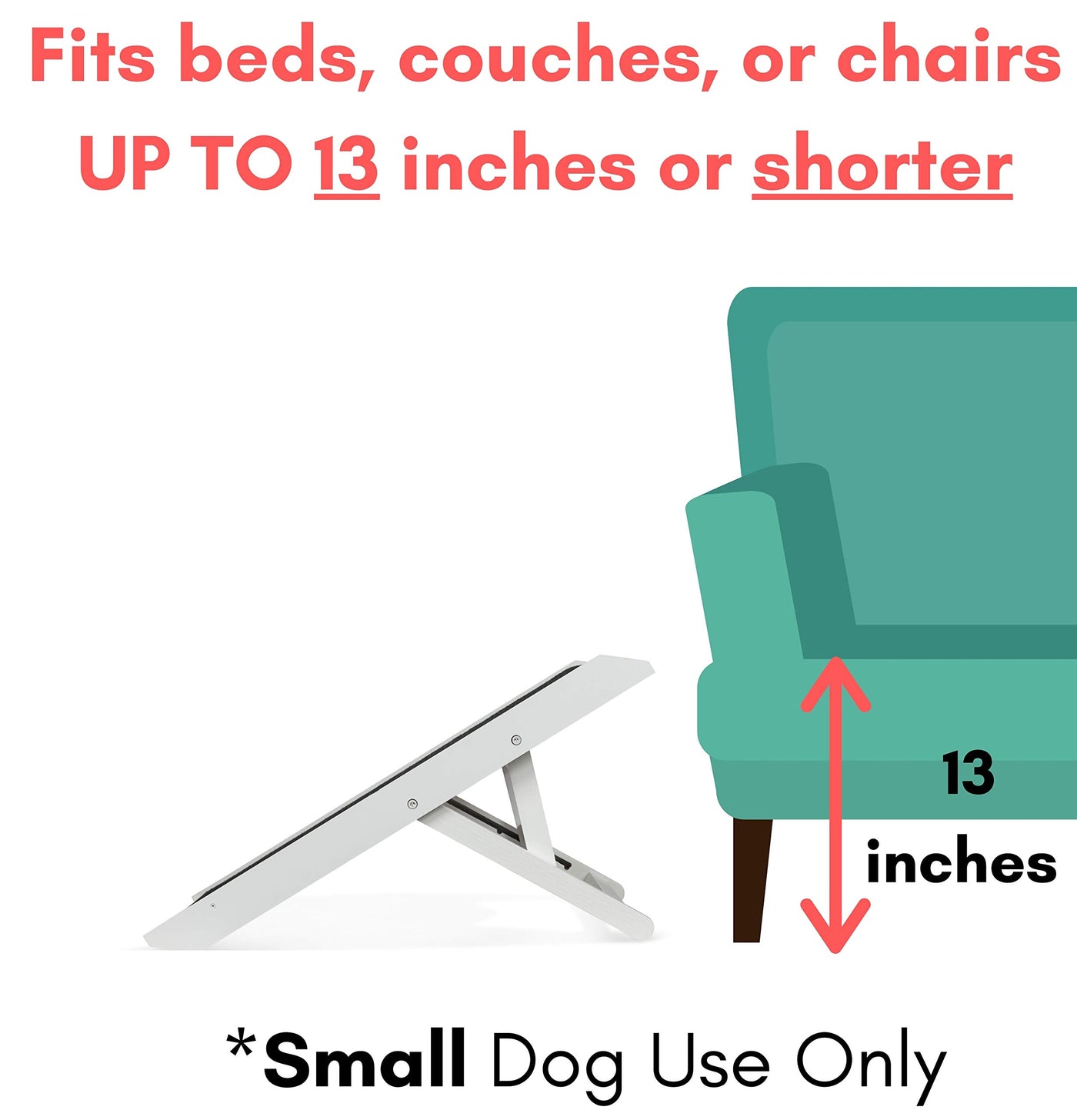 FITS BEDS or COUCHES UP TO 13 INCHES or SHORTER: please verify that the height of your bed, couch, or chair is 13 inches or shorter. The ramp needs to be in the TALLEST POSITION in order to reach most couches, beds or chairs.