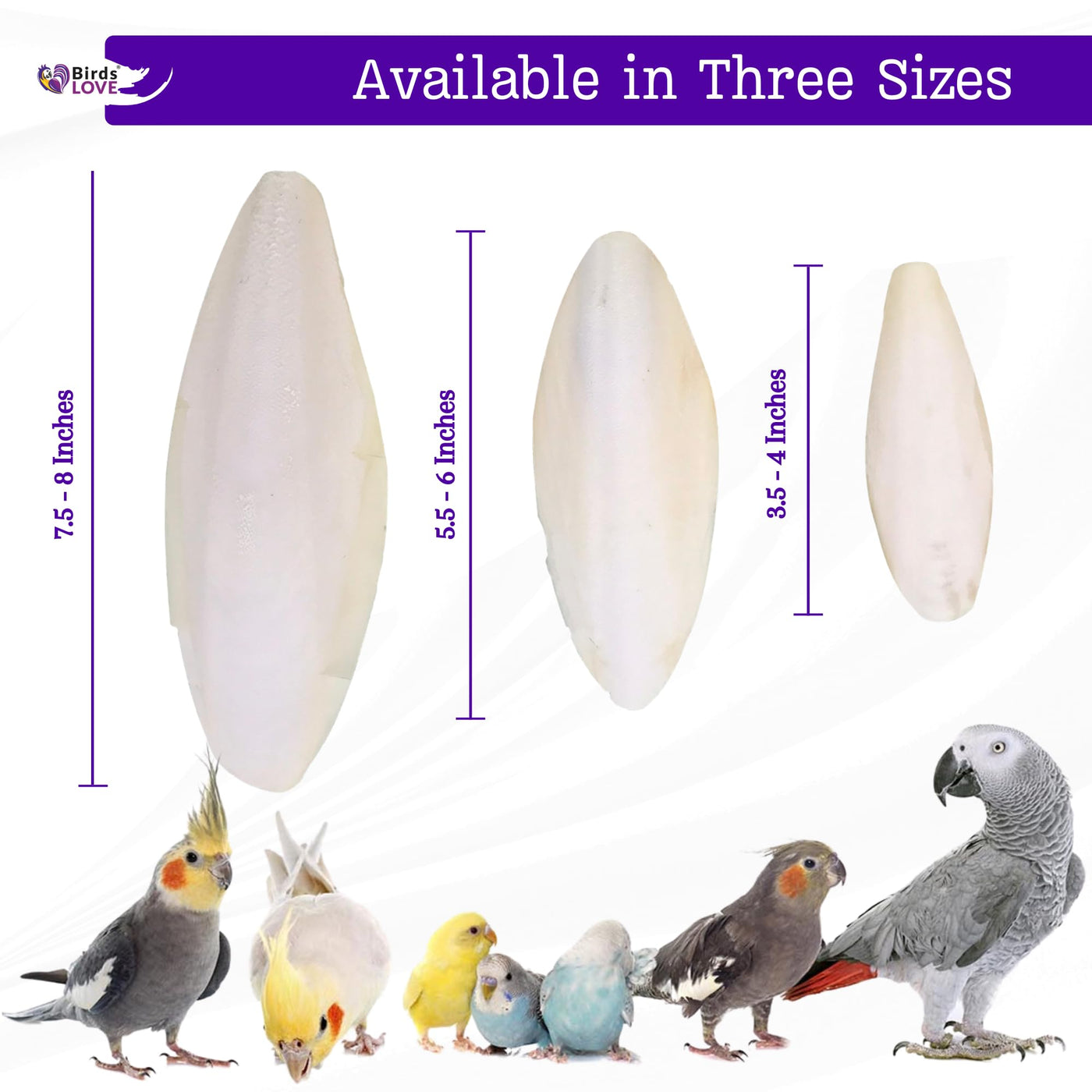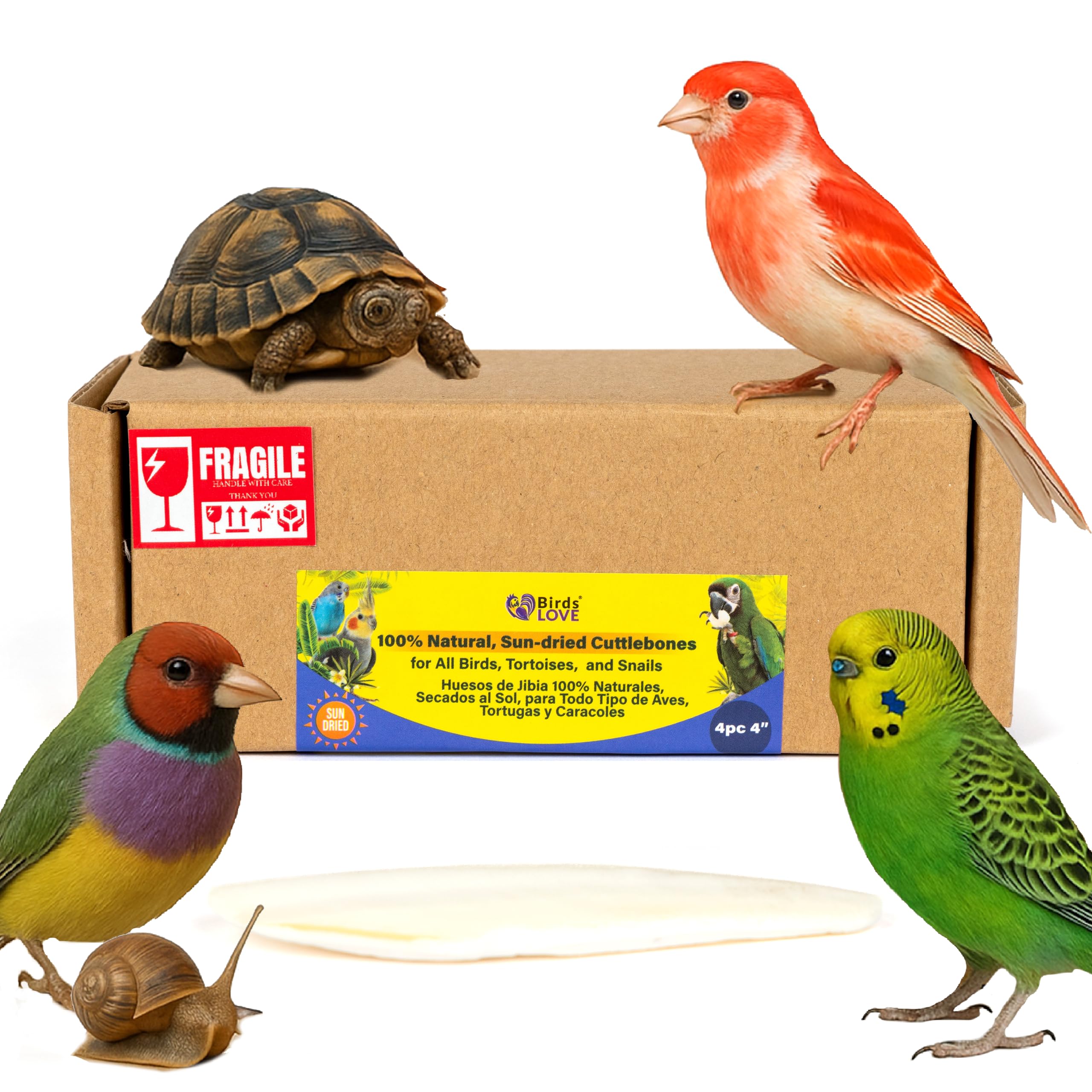 Give your pets the ultimate natural calcium supplement with Birds LOVE Natural Cuttlebone. This 100% pure sun-dried cuttlebone is packed with calcium and trace minerals essential for strong bones, proper beak health, and overall vitality. Specially designed for parrots, cockatiels, budgies, finches, tortoises, crabs, snails, and chinchillas, our cuttlebone offers beak conditioning, shell strengthening, and essential nutrition in one simple product. The rough texture naturally helps birds trim and sharpen their beaks, while birds, reptiles and crustaceans benefit from its rich calcium content for improved shell and bone health. Unlike artificial calcium blocks that look like cuttlebone, our sun-dried cuttlebone retains its natural nutrients without any harmful additives. The included sturdy cage holder ensures easy installation and long-lasting use, keeping it accessible for birds to chew and enjoy. Measuring 3.5-4 inches per piece in a convenient 4-pack, this size is ideal for small to medium-sized birds and pets. For added versatility, simply scrape the cuttlebone into a fine powder and mix it with food for an extra calcium boost. We also offer cuttlebone in 5.5 to 6 , and 7.5-8 for larger birds and pets. Enhance your pets health, happiness, and engagement with Birds LOVE Natural Cuttlebone-the essential supplement for strong beaks, shells, and bones. Order yours today!