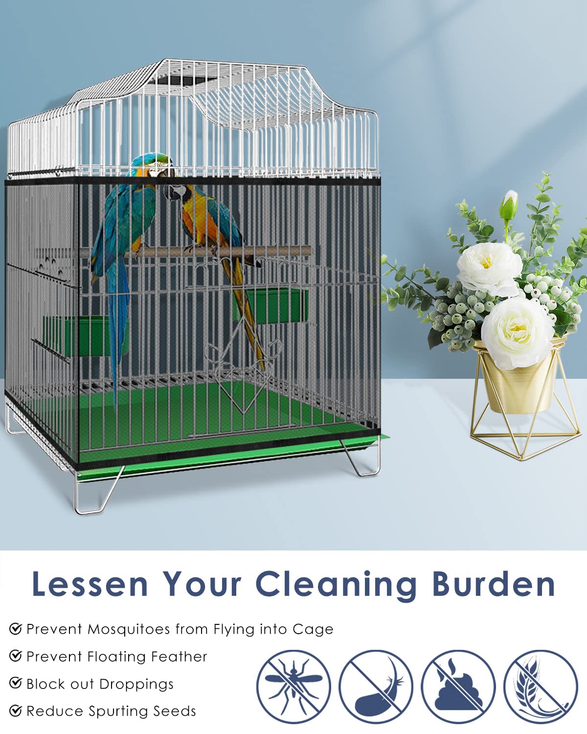 Quick-drying Material: Bird cage net is made of nylon mesh, which is soft and breathable. And it is easy to hand or machine wash and quick drying. It is excellent dust resistance, and can be used for a long time | Elastic Band Design: The bird cage cover large is fitted with elastic band to keep the birdcage cover firmly in place and prevent the birdcage cover from slipping. It is an adjustable circumference of 59-90inch and a height of 15.7inch, which fits perfectly into a variety of square, round and oval cages | Keep It Clean: Our bird cage food catcher fit securely around your birdcage to help you prevent cluttered seeds from spreading on the floor, keeping your birdcage and floor clean | Air circulation: Birdcage seed guard is made of mesh fabric. The fine mesh covering allows air and light to pass easily, keeping pets cool and relaxed, providing a comfortable living place for your birds, pet owners can too see their pets clearly | Easy to Install: No tools or complicated procedures are required. The elastic fit and comfortable design means you can simply slide it through the cage without having to tie anything or cut to fit. After adjusting to a suitable position, you can tie a small knot behind the small button to prevent the rope from falling off after tightening it