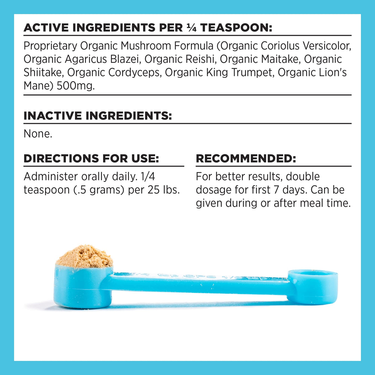 Product DescriptionSome people think mushrooms are mysterious and magical. After years of family mushroom farming, we at BIXBI simply view organic mushrooms as the healthiest option for both general wellness and to target specific concerns for dogs and cats. The potent, natural healing properties in our organic mushrooms are an excellent, holistic way to keep your dog or cat in tip-top shape. The BIXBI Immunity Daily Mushroom Powder Supplement supports your pets health and wellbeing. Dont wait until your pet gets sick to start thinking about their health, give their immune system the upper hand with BIXBI Immunity. Its made with a powerful blend of mushrooms that supplies your pet with a large range of antioxidants and polysaccharides to reduce the number of free radicals in their body. The mushrooms in our formula have also been shown to support normal inflammatory responses and both white and red blood cell production. With BIXBI Immunity, your pet is well-positioned to fend off nearly anything that comes their way. BIXBI Pet guarantees our products for quality and freshness. Be advised, we cannot guarantee any products sold by non-authorized third-party sellers. Made in the USA with USA-sourced organic mushrooms.From the Manufacturer