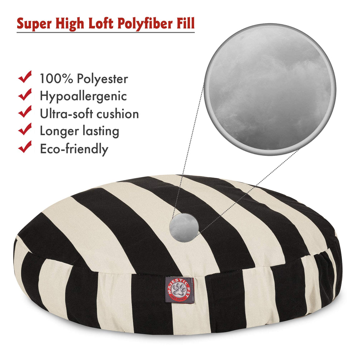 Indoors Or Outdoors, These High-Quality Dog Beds Are Just What Your Dog Needs To Keep Them Rested And Ready For Their Next Adventure. The Majestic Pet Black Vertical Strip Large Round Pet Bed Is Filled With A Generous Portion Of Super Plush Fiberfill For Warmth And Unbeatable Comfort. The Removable Zippered Slipcovers Are Woven From Durable Outdoor Treated Polyester With Up To 1000 Hours Of U.V. Protection Enabling It To Withstand Nature'S Elements. Heavy-Duty Zippers Will Stand Up To Years Of Washing And Use. The Machine Washable Slip Cover Can Be Tossed In The Washer On Machine Wash Warm, Then Tumble Dry On Low For Easy Cleaning.