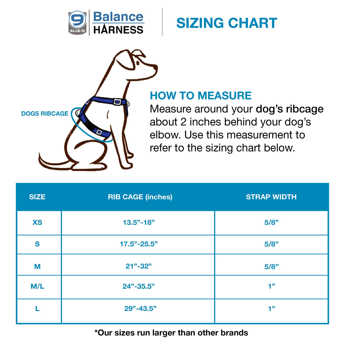 Q: How do I properly size my dog for the Balance Harness?A: To size your dog for the Balance Harness, measure around their ribcage about 2 inches behind their elbow to find the correct size. The M/L size fits ribcages from 24" to 35.5", and it's recommended to consult the size chart provided in the product images for the best fit.