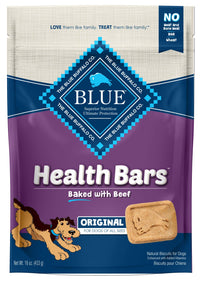 Tasty and wholesome BLUE Health Bars with Beef have a crunchy texture your dog will love Wholesome whole grains and the finest natural ingredients enhanced with vitamins and minerals work together to help keep him healthyFormulated with the FinestNatural IngredientsReal Beef First IngredientNO chicken (or Poultry) By-Product MealsNO corn Wheat or SoyNO Artificial Flavors or Preservatives