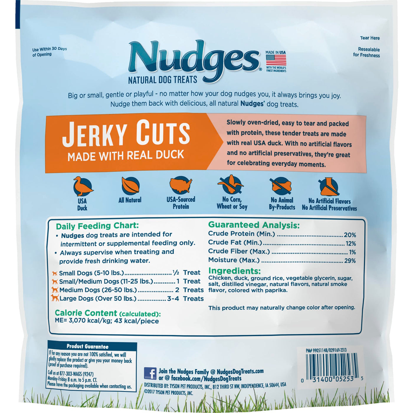 Nudges Jerky Cuts Dog Treats, Made with Real Duck are delicious, high-quality treats that dogs love and dog owners love to give. Made in the USA with real chicken and duck as the first ingredients, theyre perfect for turning any day into a special occasion for your pup. Theyre slowly oven-dried, easy to tear and packed with protein. With no corn, wheat or soy, and no animal by-products, artificial flavors or artificial preservatives, these tender treats give you an all natural way to delight your dog. Tell your dog you love them too with all natural Nudges Dog Treats. Say it with a nudge. Nudges ranked as the No. 1 natural dog treat in Nielsen Scan Data Latest 52 weeks (w/e 10/12/2019)