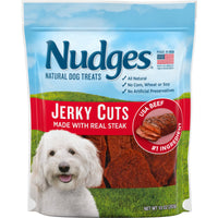 Celebrate everyday moments with Nudges Natural Dog Treats Jerky Cuts Made with Real Steak. With real USA sourced beef as the number one ingredient, these tender treats are slowly oven dried, easy to tear and contain no artificial flavors or preservatives. Made with no corn, wheat, soy or animal by products, these all natural protein treats are the perfect reward for the one who makes every day better. Includes one 10 oz resealable package.