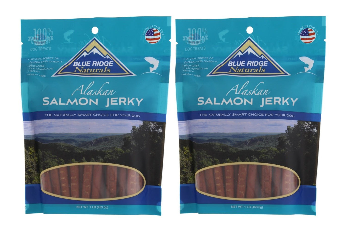 Contains two (2) Blue Ridge Naturals Alaskan Salmon Jerky Dog Treats, 1lb each. Blue Ridge Naturals Salmon Jerky is made from real Alaskan salmon. Rich in Omega-3 and Omega-6 fatty acids, salmon is beneficial for your dog s cardiovascular and joint health. These tasty treats also promote skin and coat condition. They are wheat free and are sure to become your pets favorite snack! Don t settle for meat-flavored treats when you can give your friend the real thing