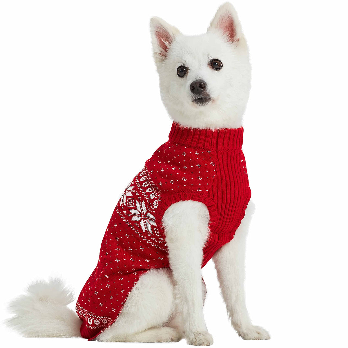Q: What makes this dog sweater a good choice for the holiday season?A: The Blueberry Pet Christmas Snowflakes Dog Sweater features a classic mockneck design with festive snowflake and chevron patterns in true red and white, making it a stylish and essential item for celebrating the holiday season with your pet.