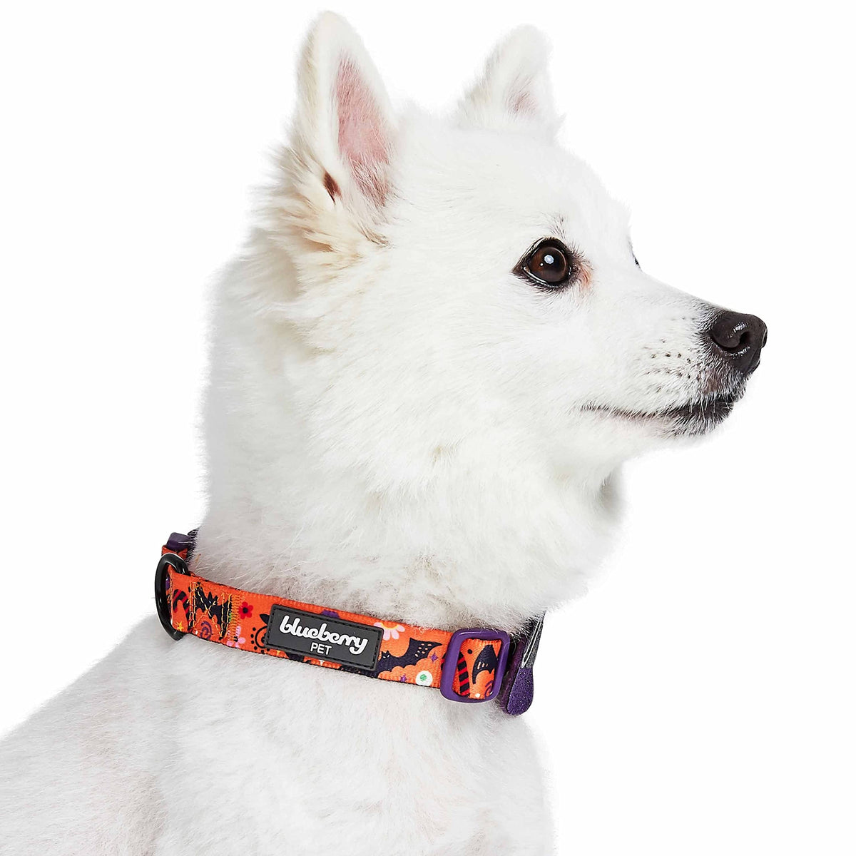 Q: How should I care for the Blueberry Pet Halloween collar?A: To care for the collar, gently clean it with a damp cloth. Avoid using harsh chemicals and ensure it is completely dry before putting it back on your dog. Always check for wear and tear before each use.