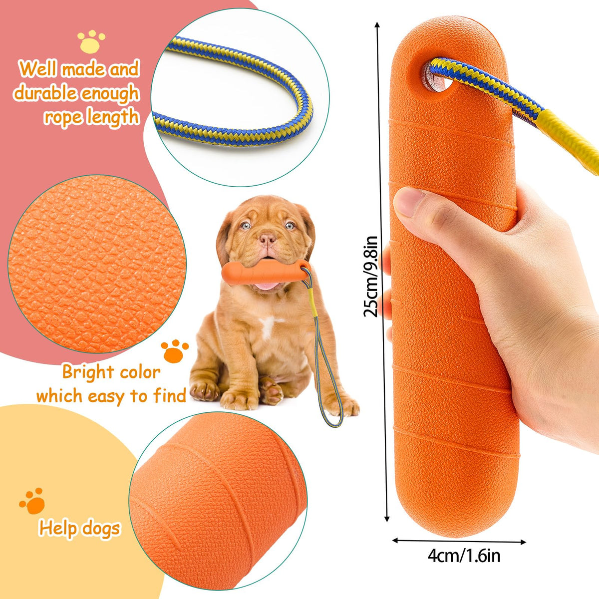 Features: The Eva Material Applied In Crafting These Water Sticks Makes Them Easy To Clean Post Play Session. Furthermore, Their Durability Ensures They Last For A Long Time, Even With Your Dog'S Enthusiastic Chewing Nature. Not Just For Playing, These Sticks Also Help Create A Special Bond With Your Pet. The Chase And Fetch Activity Will Eventually Strengthen Your Bond And Love With Your Pets, Making Your Dog High Spirited And Mentally Stimulated. Specifications: Material: Eva Color: Orange, Yellow, Dark Blue, Green Size: About 8.66 X 1.89 X 2.05 Inch Package Includes: 4 X Dog Throwing Water Stick Notes: Manual Measurement, Please Allow Slight Errors On Size. The Color May Exist A Slight Difference Due To Different Screen Displays. Small Items Are Included, Please Keep Them Away From Pets In Case Of Choking Risk. Before Purchase, Confirm Whether The Product Size Is Suitable For Your Pet, And Observe The Pet'S Reaction When Using. Please Remove The Product In Time If There Is Any Discomfort.