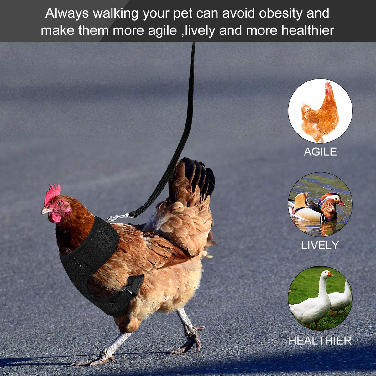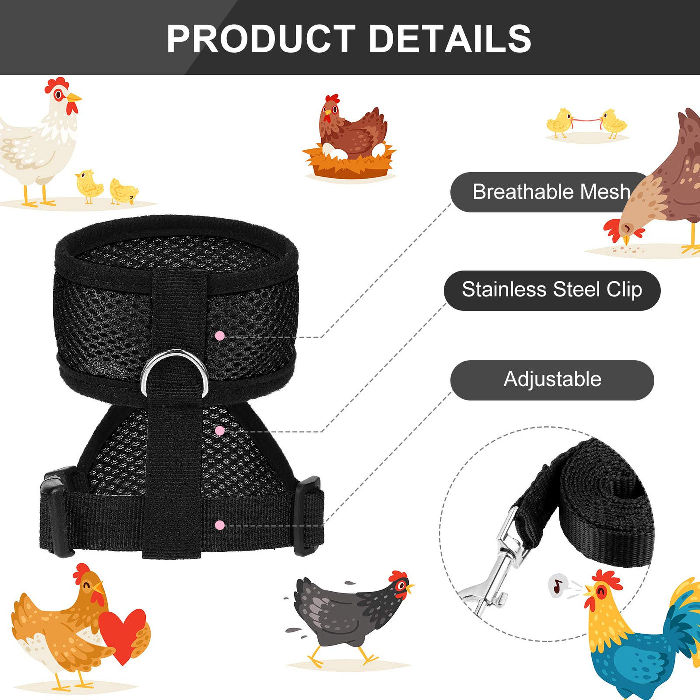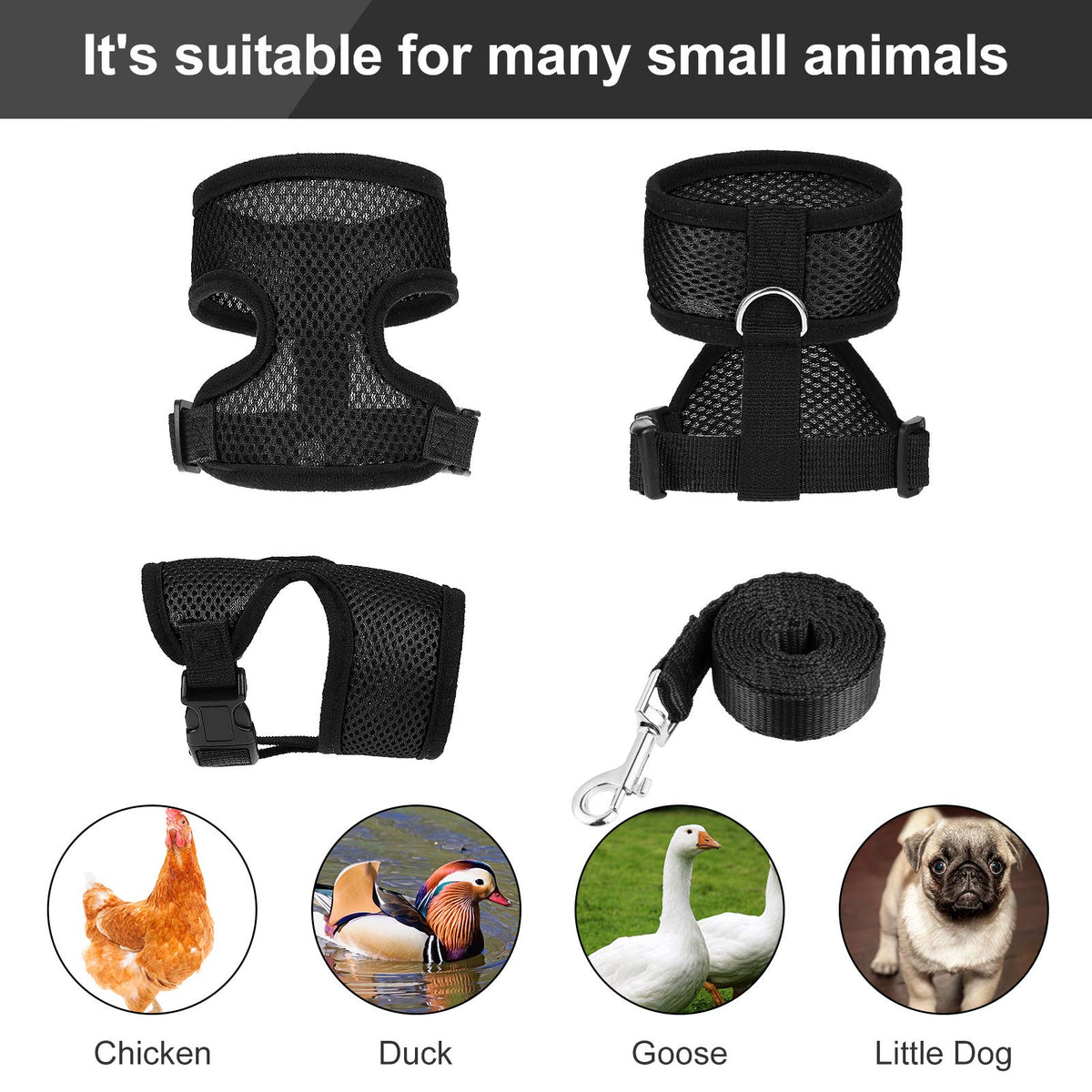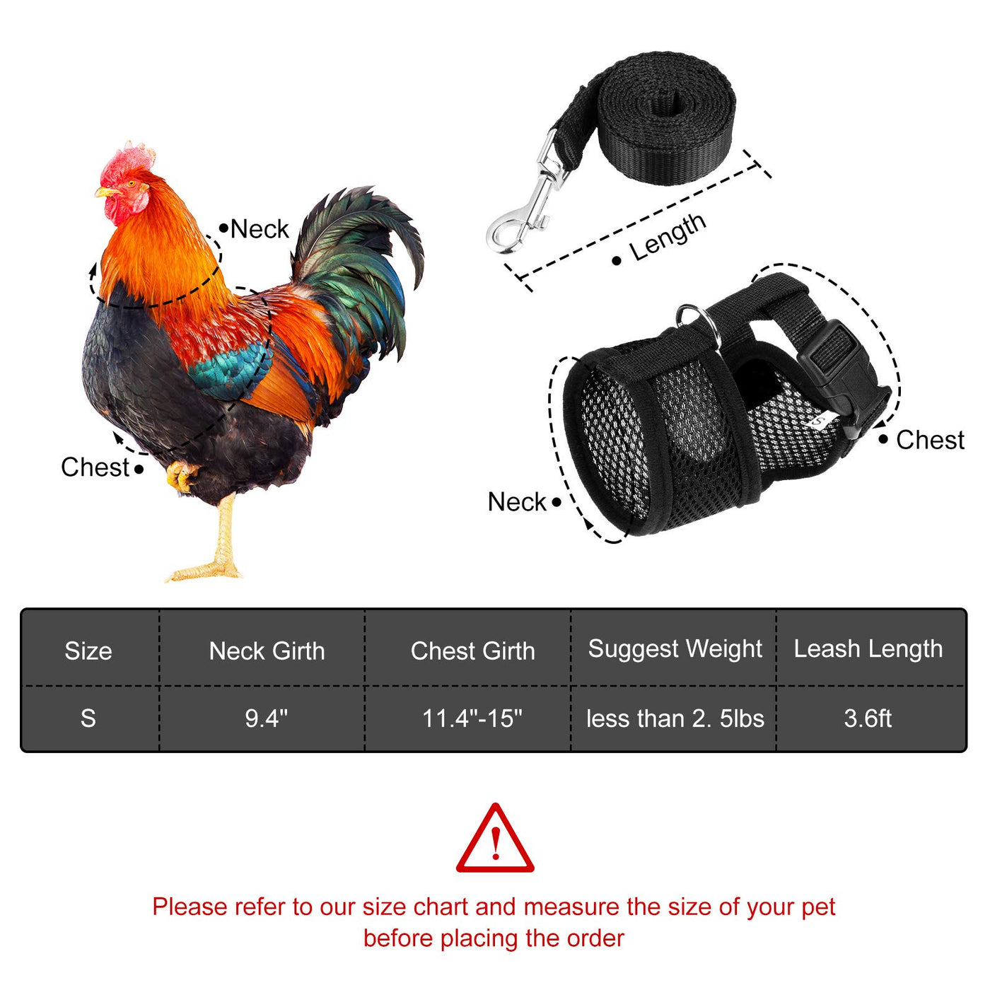 3 Pieces adjustable chicken harness with leash and matching belt, comfortable hen vest breathable chicken training harness for chicken, duck or goose pet training walkingSmooth using time: Nylon material adopted is breathable to keep your chicken and duck cool on hot days, but also provides protection in those chilly occasions. Soft wrap of the chicken harness aims to offer a smooth and comfortable wearing period to your pets, creating no strain and pulling to their neck. Safety harness gives more space to adjust the buckle to adapt your pet's body and even distributes the pressure around the chest to avoid choking.Wide range of application: Breathable hen vest has an appropriate size to fit small pets, including chicken, duck or goose, walking them in the outside with the vest and leash is convenient for you to manage your pets' movement in time.Specification:Material: nylonColor: as pictures shown S: 11.4-15 inches in chest girth, 9.4 inches in neck girth, for pets with a weight less than 2.5 lbsM: 13.4-17.7 inches in chest girth, 10.2 inches in neck girth, for pets with a weight of 2.5-3.6 lbs Package includes:3 x Chicken harnessesNote:Manual measurement, please allow slight errors on size.The colors may exist slight difference due to different screens.