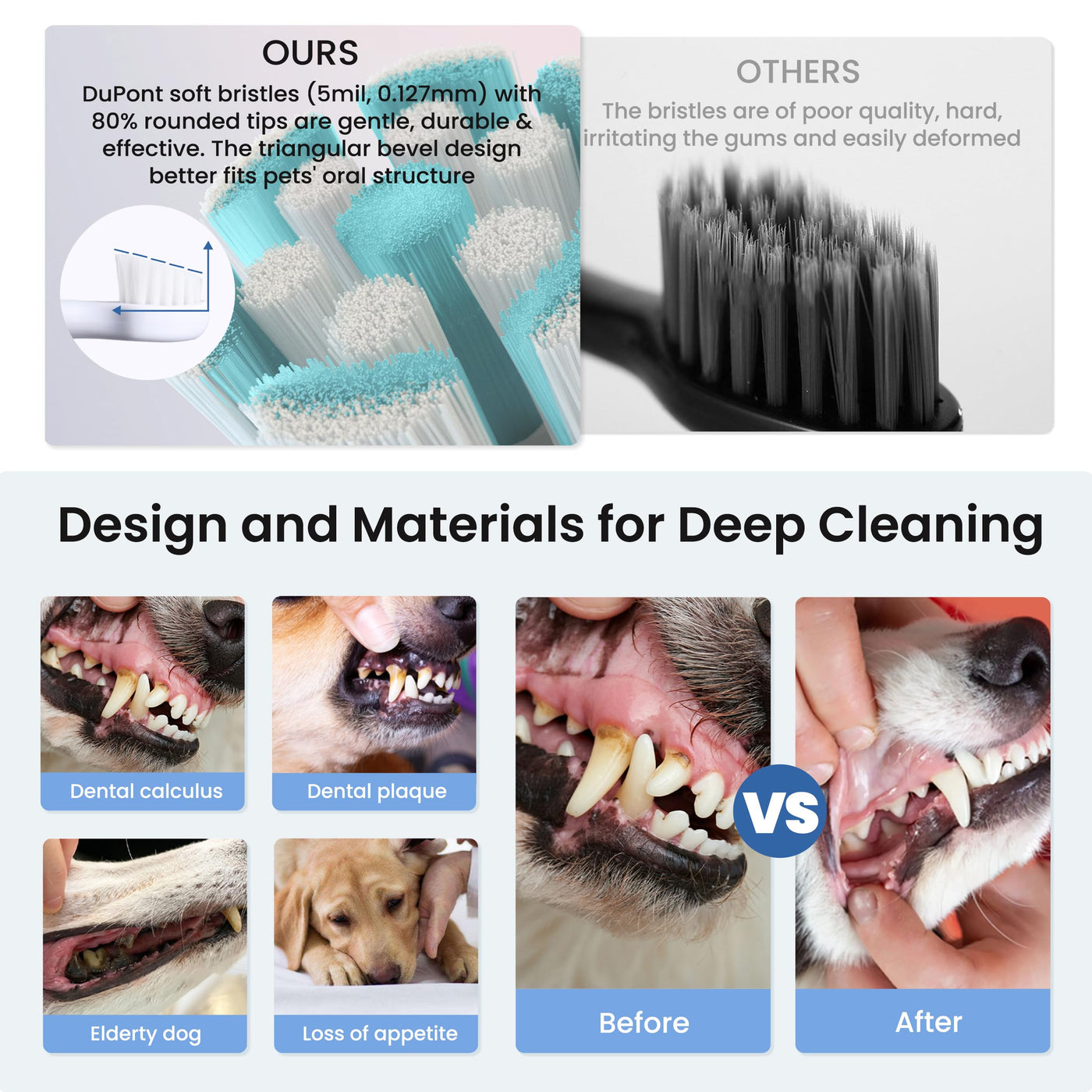 Innovative 3-in-1 Cleaning - The pet electric toothbrush is the first 3-in-1 solution in pet care,combining brushing,water flossing,and tooth cleaning.Brushing while rinsing helps reduce plaque and tartar swallowing,decreases oral spread,and eliminates bad breath.It minimizes the risk of periodontal disease and saves on pet medical costs,making oral care simple and effective