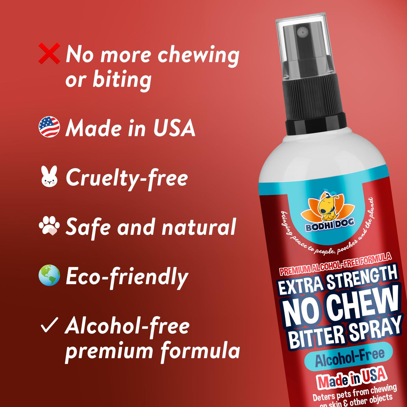 Help Keep Your Furry Friend From Chewing On Paws, Hot Spots, Wounds, And Items Inside Your Home! Safe For Various Surfaces Including Wood, Fabric, Leather, Suede, Microfiber, Carpet, Stone, Marble, Rope, Bamboo, Veneer, Stucco, Plaster, Plastic, Rubber, Corkboard, Houseplants, And Garden Plants. Shake Well Before Each Use. Hold Bottle 4-6 Inches From Area Or Item You Wish To Stop Your Pet From Chewing And Spray Liberally To Completely Cover. Our Spray Is Safe For Various Surfaces But Please Test An Inconspicuous Area Prior To Use. If Color Loss Or Spotting Occurs, Do Not Use It! Reapply As Needed Until Your Pet Is Trained. If Using Topically On Your Pet, Spray Directly On The Intended Area On Your Pet. Be Sure To Avoid The Eye Area And Around. We Are A Small Family-Owned Business Committed To Your Full Satisfaction. We Are Committed To The Planet As Much As We Are You And Your Pet'S Happiness. Bodhi Dog Extra Strength No Chew Bitter Spray And Packaging Are Made Using The Most Socially Responsible And Eco-Friendly Methods Available Right Here In The Usa. Please Note: Make Sure To Always Use It In A Well-Ventilated Area. Use Sparingly At First As A Precaution To Test For Adequate Ventilation. Bodhi Dog Products Are The Conscientious And Socially Responsible Pet Owner'S Choice!
