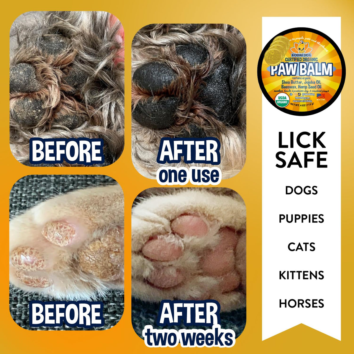Keep Your Pets Feet Happy And Healthy With Our Effective All Natural And Organic Paw Soother Balm. Our Superior Formula Is Not Too Thick, Creamy Or Sticky And Absorbs Well To Clear Up Dryness, Scratchy And Callused, Hard Paw Pads Leaving Them Instantly Softened And Conditioned. To Use: Gently Massage Into Your Pets Paw Pads To Heal And Protect. Use Regularly For Best Results. Warning: External Use Only. Avoid Eye Contact Or Ingestion. Please Note A Persistent Dry, Cracked Feet May Be The Result Of An Extreme Allergy, Your Dog Being Sick Or Having An Illness Or Injury. If No Improvement Is Seen After Consistent Use, Please Contact Your Vet. We Are A Small Family Owned Business Committed To Your Full Satisfaction, Love Our Oganic Paw Balm. We Are Committed To The Planet As Much As We Are You And Your Pet'S Happiness. Our Organic Paw Balm And Packaging Are Made Using The Most Socially Responsible And Eco-Friendly Methods Available Right Here In The Usa. Bodhi Dog Products Are The Conscientiousand Social Responcible Pet Owner'S Choice! Made In The Usa