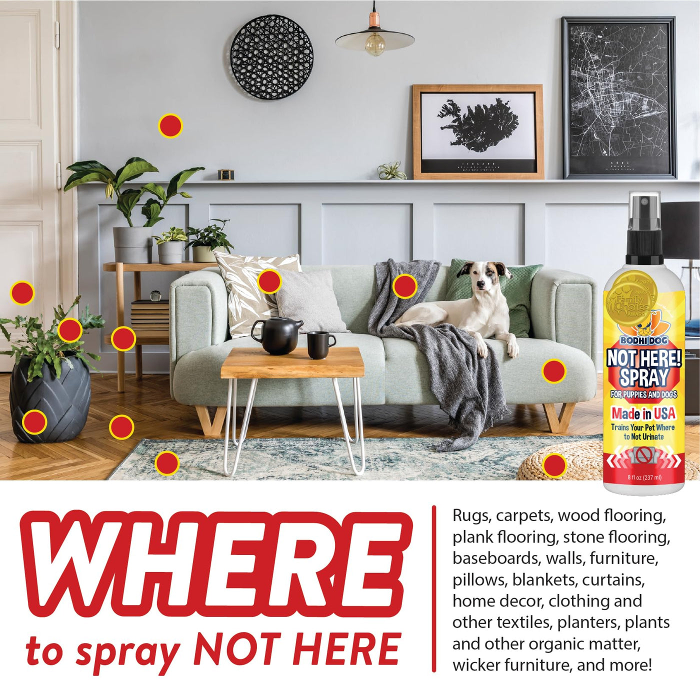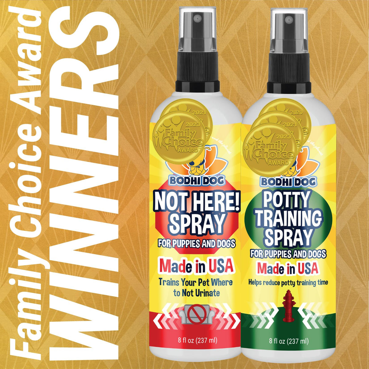 Our potty training spray for dogs is specially formulated to train pets where you want them to relieve themselves. Help prevent your pet from damaging your carpet in your home! For indoor use, select a designated location and place a newspaper or puppy training pad there. Allow the puppy to sniff the pad and reward them when they use that spot. Continue the training by reapplying the product and bringing your pet back to the spot after activities. For outdoor use, select a designated outdoor location. Spray a liberal amount on that area. Allow them to sniff the area and reward them when they use that spot. For best results reinforce good potty training behavior with praise and treats! Reapply as needed until your pet is trained. We are a small family owned business committed to your full satisfaction. We are committed to the planet as much as we are you and your pet's happiness. Our dog potty training spray and packaging are made using the most socially responsible and eco-friendly methods available right here in the USA. Bodhi Dog products are the CONSCIENTIOUS AND SOCIALLY RESPONSIBLE PET OWNER'S CHOICE! MADE IN THE USA.