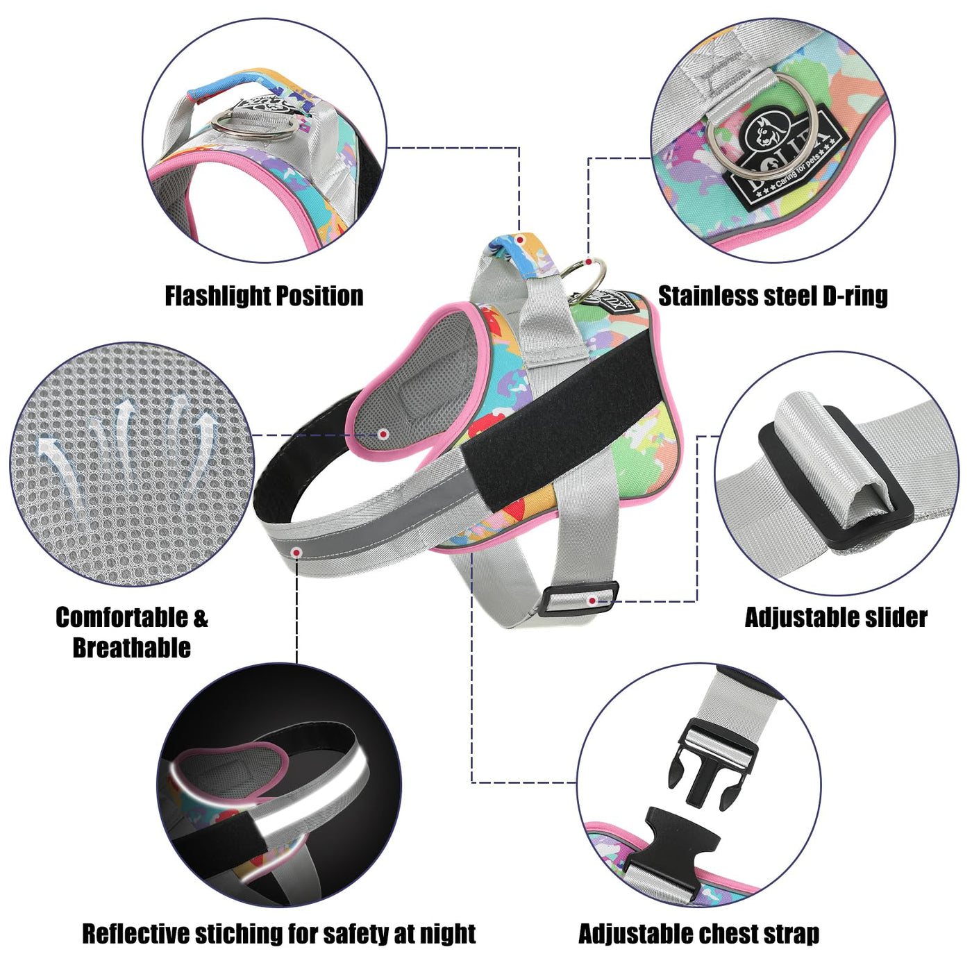 Q: Is the harness safe for outdoor use at night?A: Yes, the harness features reflective straps that enhance visibility, keeping your dog safe during nighttime walks. This safety feature is especially beneficial for outdoor activities such as running or hiking in low-light conditions.