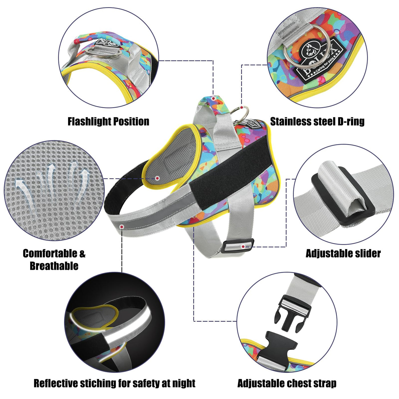 Q: Is the Bolux Dog Harness suitable for outdoor activities?A: Yes, the Bolux Dog Harness is perfect for outdoor activities such as walking, running, hiking, and training. It includes reflective straps for visibility during nighttime walks and a sturdy handle for better control in crowded areas.