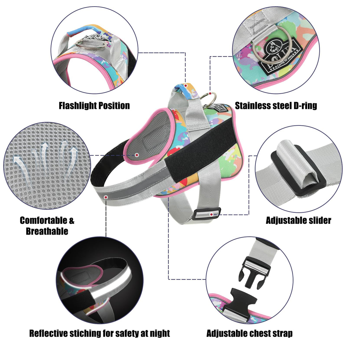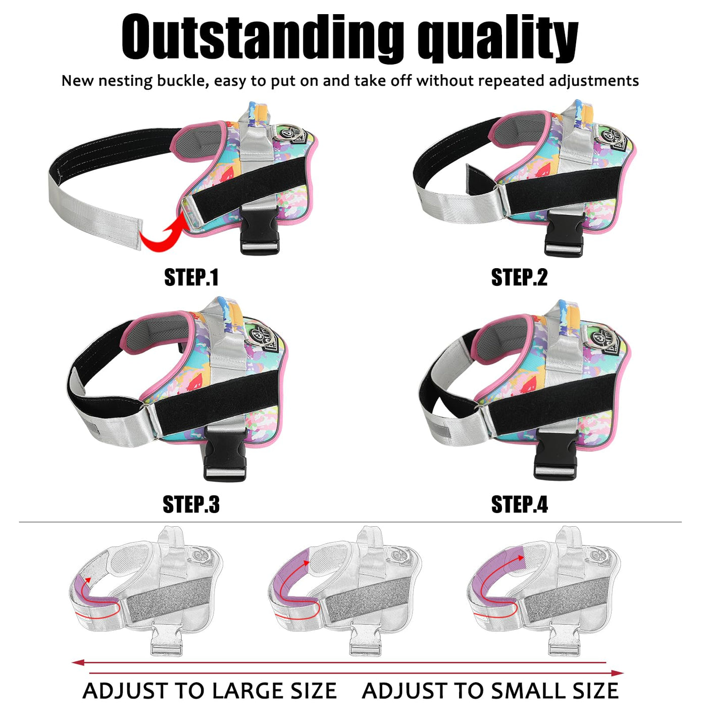 Perfect for dogs such as rescue dogs, reconnaissance dogs, guide dogs, and so on. Every corner and arc of the product shows extraordinary individuality and difference. Each working procedure has its own ingenuity. The reflective adjustable pet vest with handle, is no more pulling, tugging or choking, has great tension, bold and unrestrained appearance. Suitable for all kinds of small, medium and large dogs.
