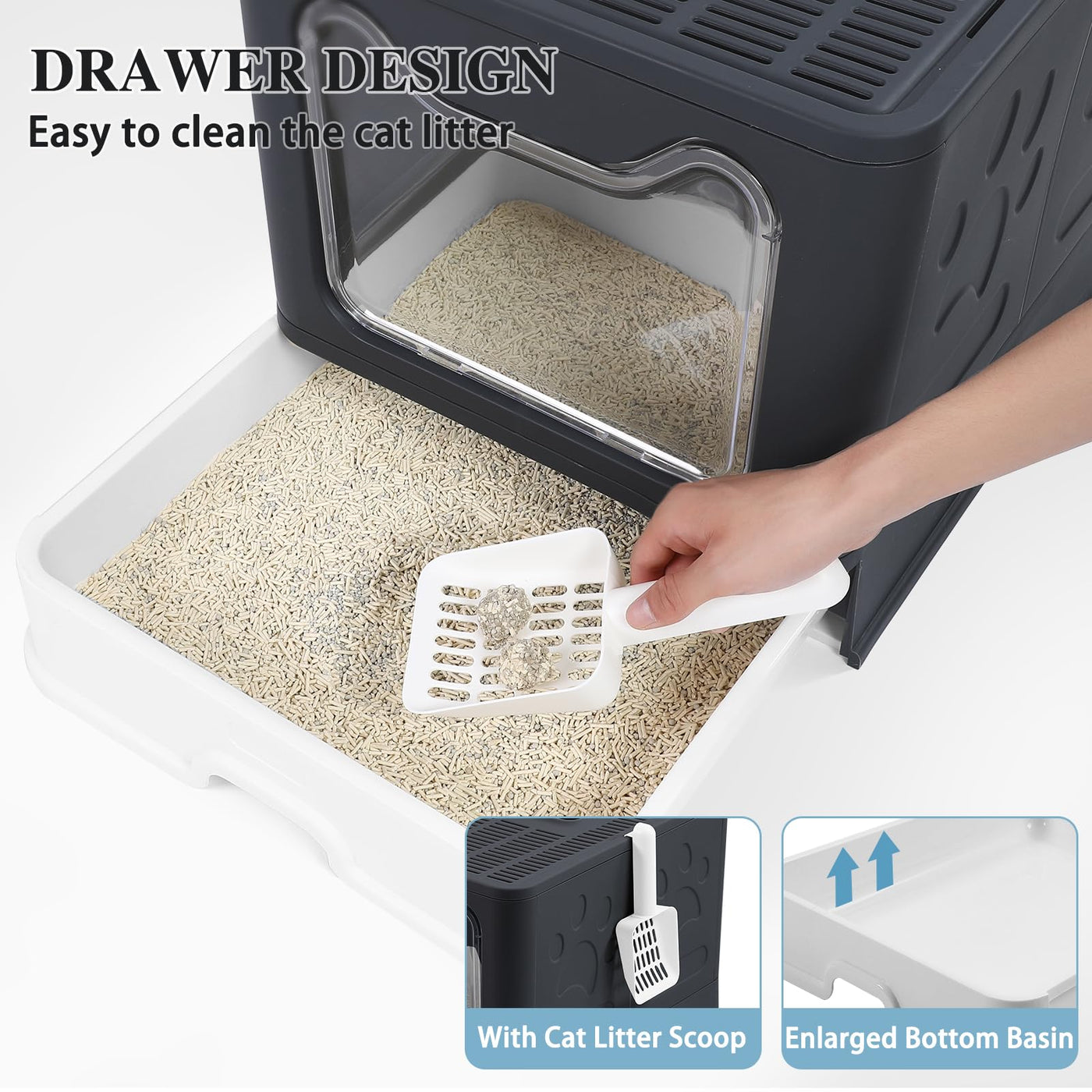 Q: How does the drawer design of the litter box make cleaning easier?A: The drawer design allows you to easily pull out the tray for quick cleaning. You can use the included cat litter scoop to efficiently remove waste, making the cleaning process faster and more convenient.
